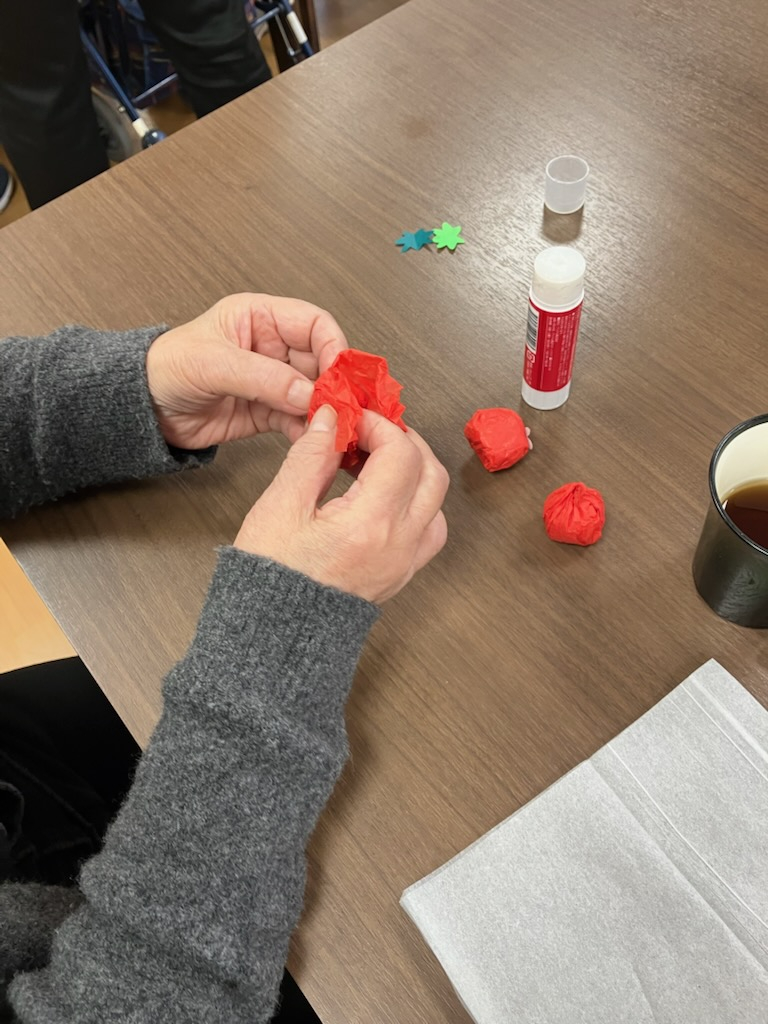 まず初めに、ティッシュペーパーを丸め、赤いお花紙で包む工程。皆さん器用で真剣に丸めていました。