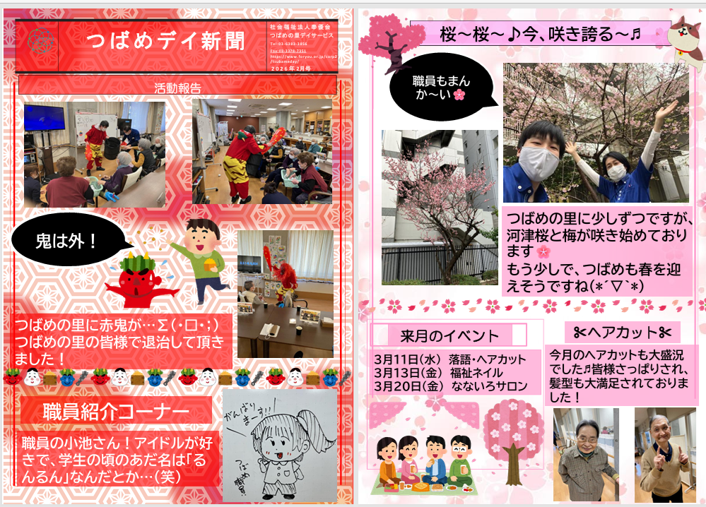 2026.03.09 ニュース つばめデイ新聞 2026年2月号 Tweet シェアする つばめの里デイより「つばめデイ新聞」2026年2月号が発行されました。 デイフロア内に赤鬼が登場、豆まきのご様子を紹介しております。 つばめデイ新聞 2026年2月号.pdf 渋谷区つばめの里・本町東高齢者在宅サービスセンター M 前の記事 2026.03.10 ニュース もしもの災害への備え ★ 次の記事 2026.03.06 ニュース 3月の月間プログラム表 一覧へ戻る