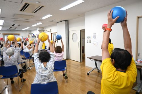 ゆうゆう高円寺北館では、暑さに負けず元気いっぱい「いちばん体操」が行われました。準備体操のあとは、早速ボールを使った体操。1、2、3、4の掛け声に合わせて、ボールを両手で上にあげたり背中に回したり。背筋や腕が伸びてとってもいい気持ち!