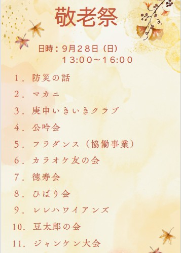 ※敬老祭当日のお部屋の団体利用は休止いたします。ご不便をおかけいたしますが宜しくお願い申し上げます。