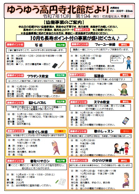 スポーツの秋! 芸術の秋! いろいろ新しいことにチャレンジしてみたくなる季節です。ゆうゆう高円寺北館にも是非お気軽にお立ち寄りください。