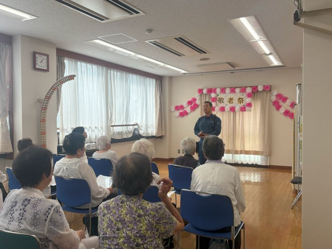 まずはじめに、南阿佐ヶ谷消防署職員による防災のお話がありました。防災にちなみ、参加者の皆様に、防災食の五目御飯もお配りしました。