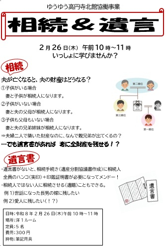 ゆうゆう高円寺北館では、2月26日(木)に「相続&遺言」の勉強会を実施します。少人数で、経験談や苦労話を語り合いながら、気になる問題を一緒に学んでみませんか? これから起こるさまざまな場面で、きっと役に立つでしょう。皆さまのご参加をお待ちしています。