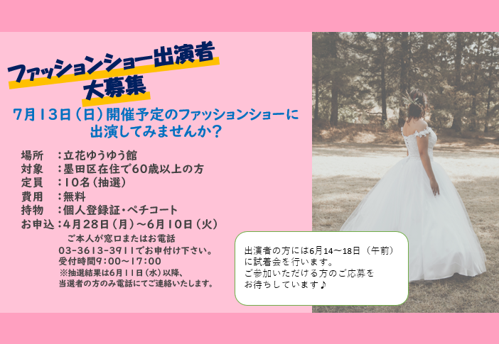 2025.05.20 お知らせ ☆ファッションショーで素敵なドレスを着てみませんか Tweet シェアする 7月13日開催予定のファッションショーの出演者を募集しています。 普段は着れないドレスをこの機会に着てみませんか? ぜひぜひご応募お待ちしています♪ 立花ゆうゆう館 KN #sumida #立花ゆうゆう館 前の記事 2025.05.20 お知らせ 塗り絵とちぎり絵&編み物タイム 次の記事 2025.05.20 お知らせ 墨友会サークル活動 一覧へ戻る