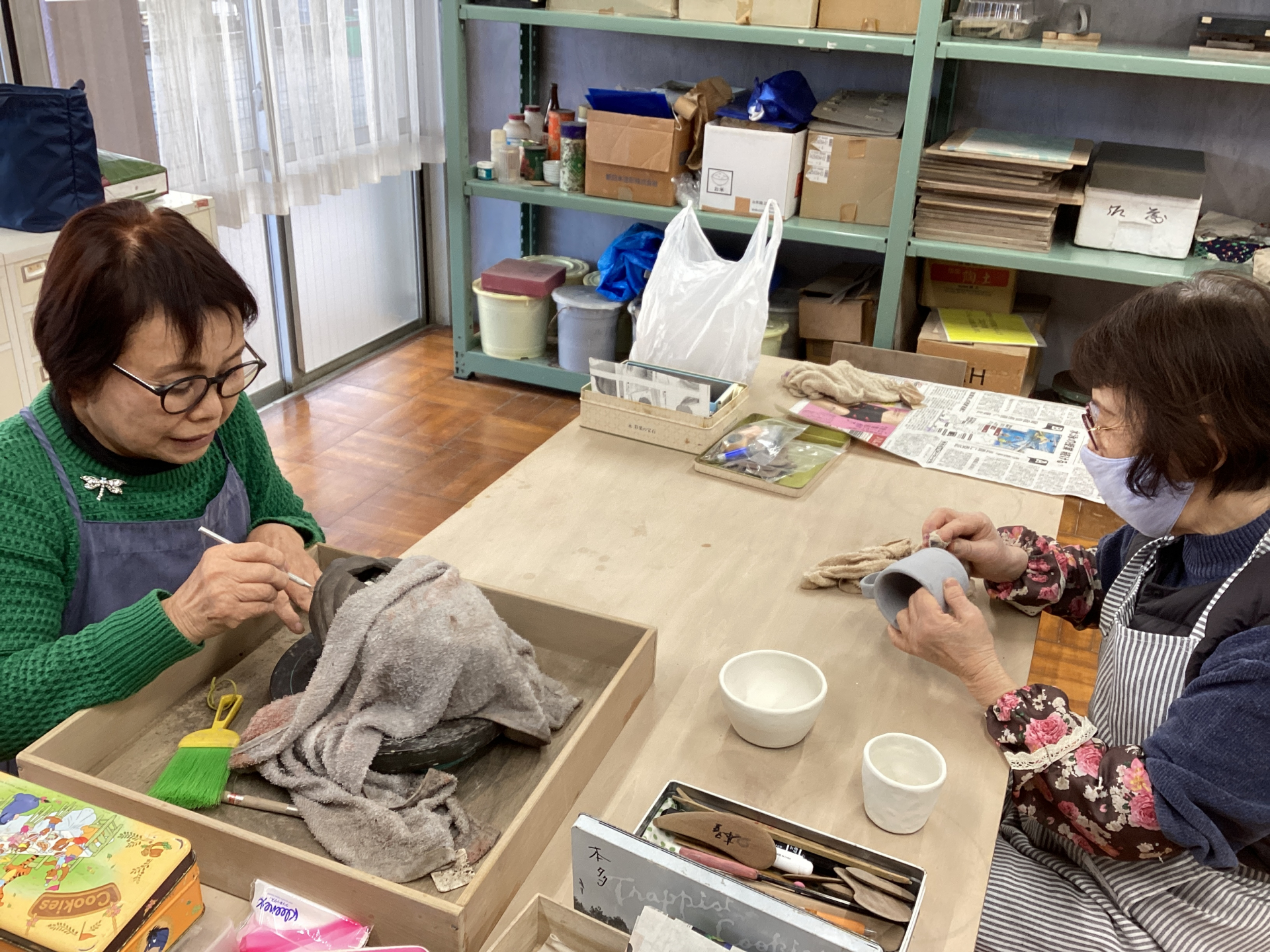 窯出しをされてカップを釉薬にくぐらせてふき取りや花瓶削りをされています。