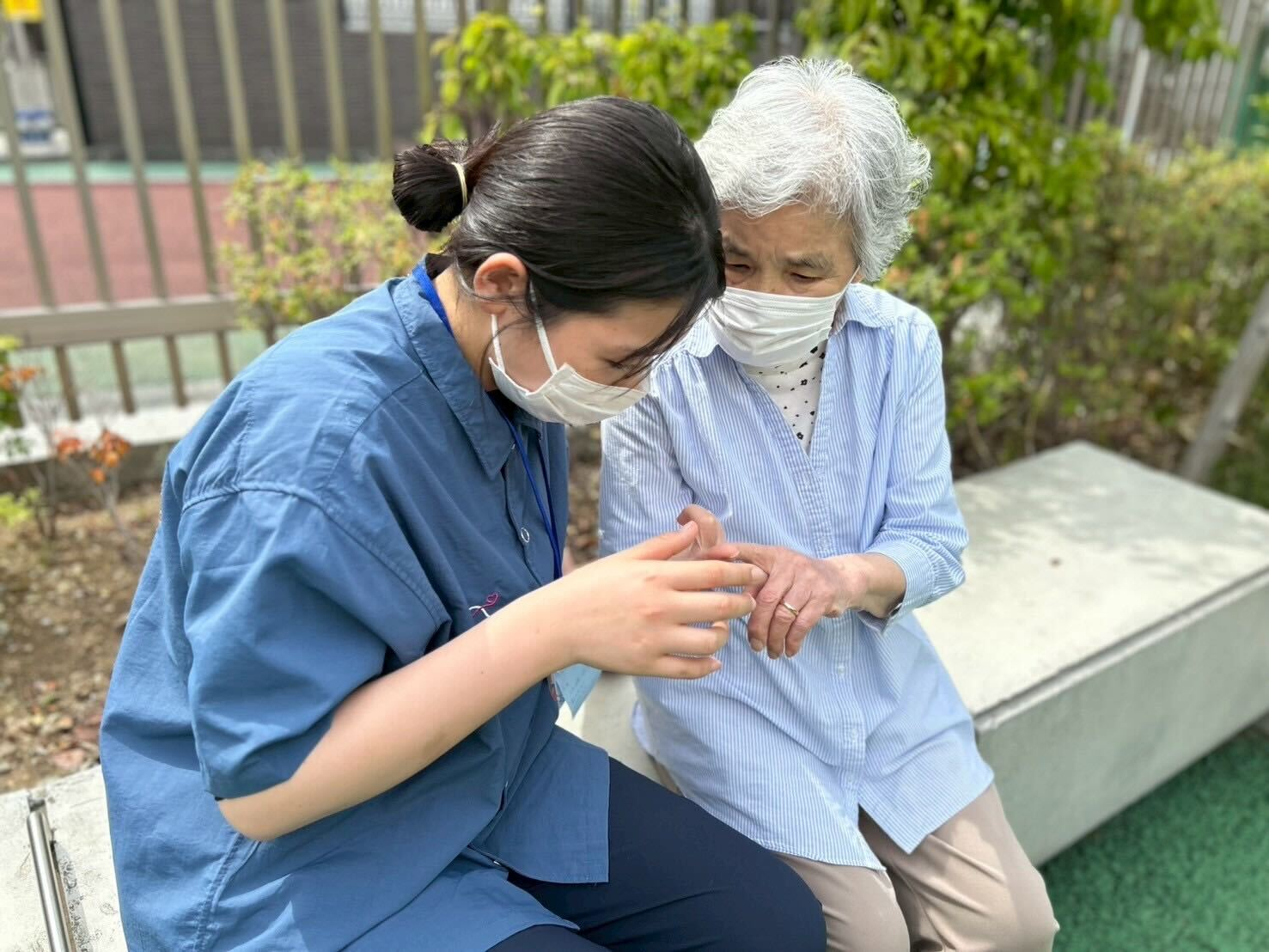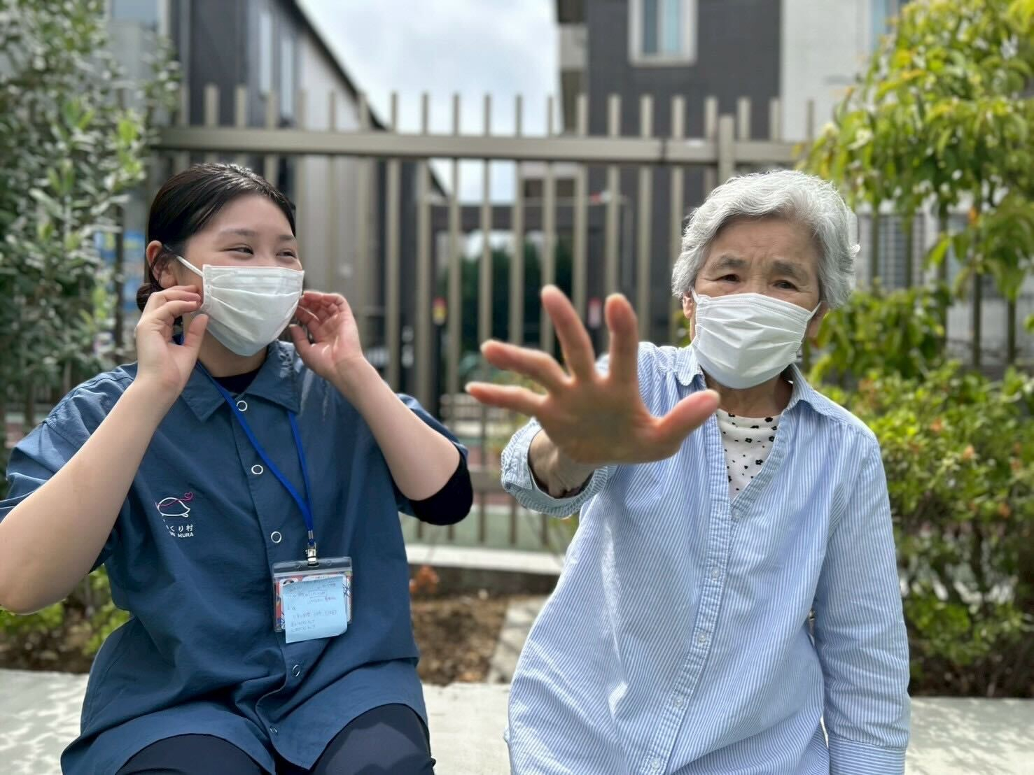 ベンチでちょっと一息。「気持ちがいいね」「連れてきてくれてありがとう」。そんな言葉に、こちらもあたたかい気持ちになります。