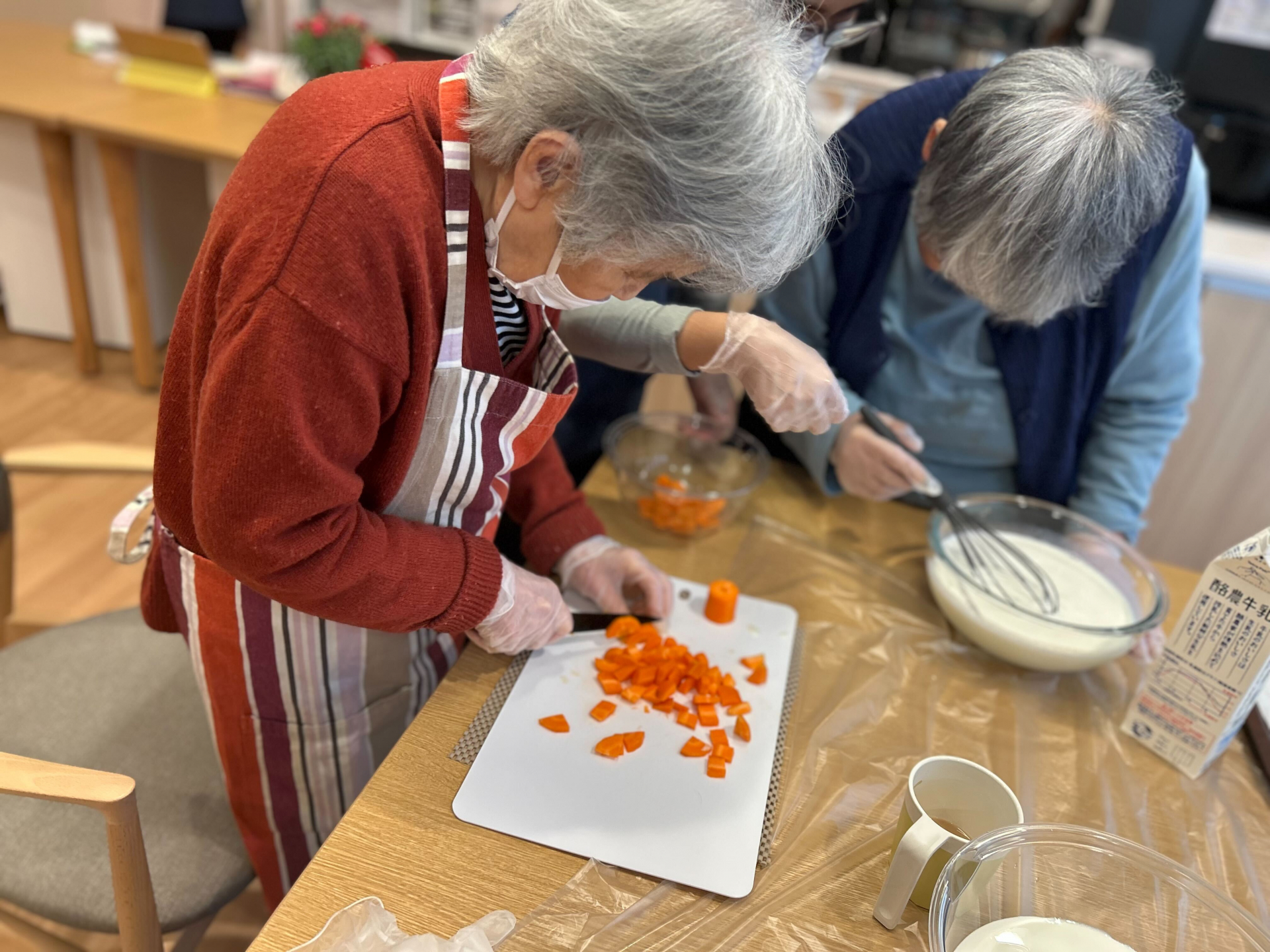 にんじんやじゃがいもの皮をむき、玉ねぎを刻み、お鍋でじっくり煮込んでいく工程は、どれも手慣れたご様子で、「毎日料理してたからね」「カレーは得意なのよ」といった声が自然とあがり、作業も会話も和やかに進みました。
