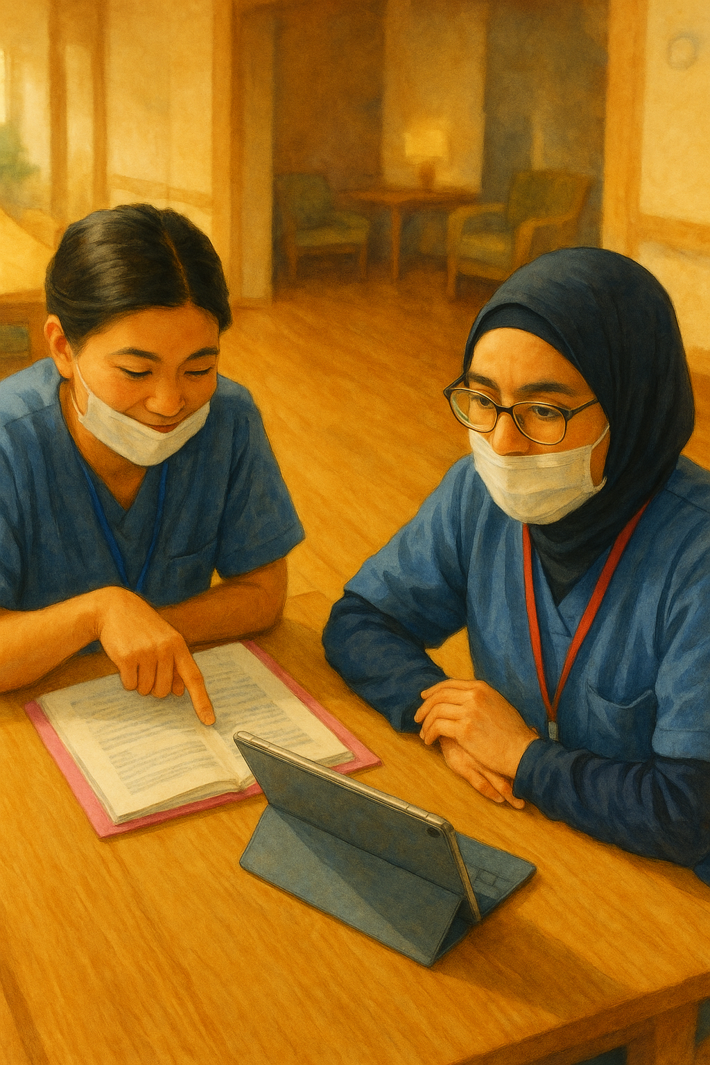 写真の1枚は、外国人スタッフ同士が真剣な表情で研修に取り組む様子。介護の専門用語や、日本ならではの生活支援のルールなど——。一つひとつ丁寧に確認し合いながら、日々のケアに活かす学びを重ねています。