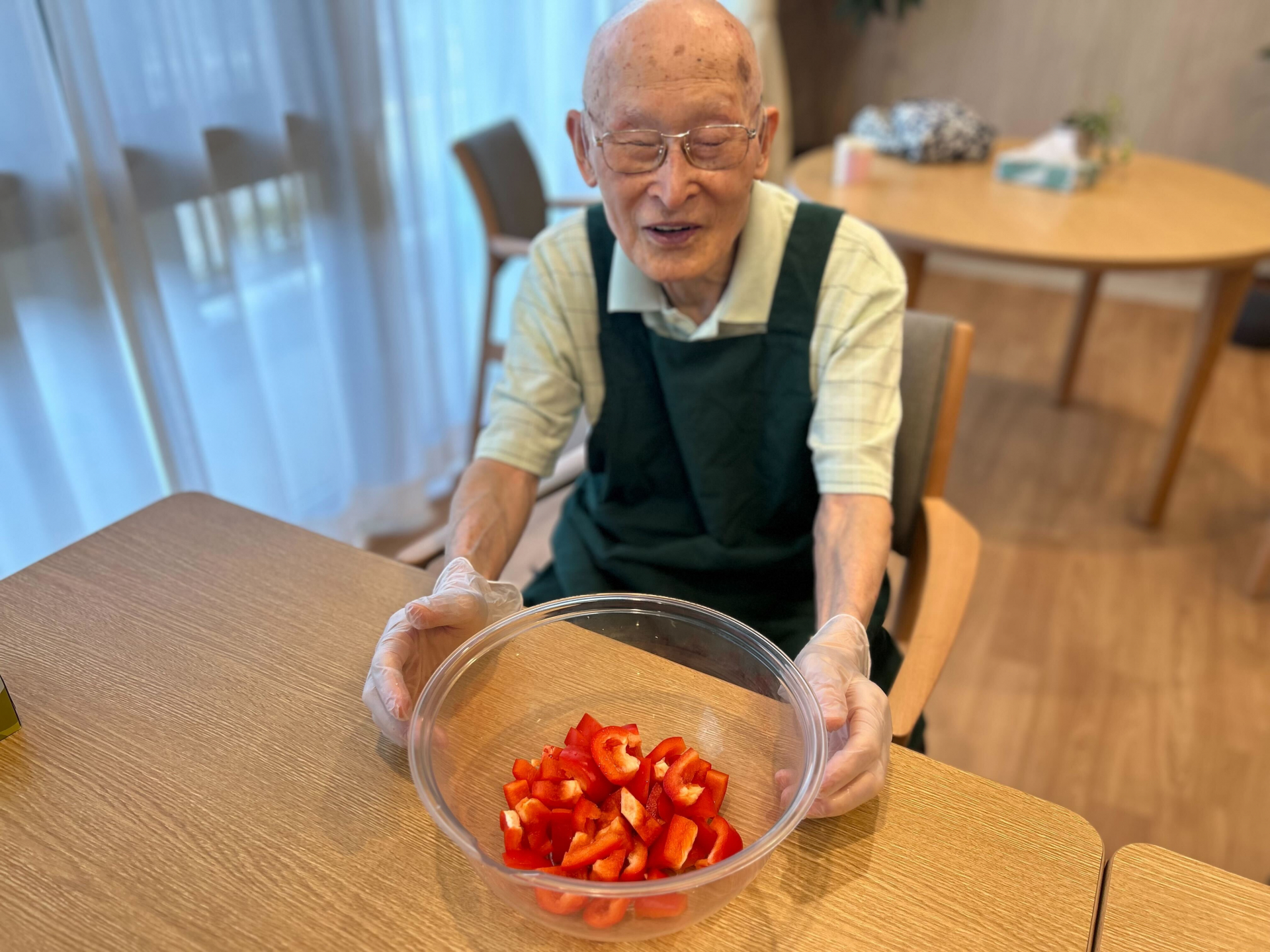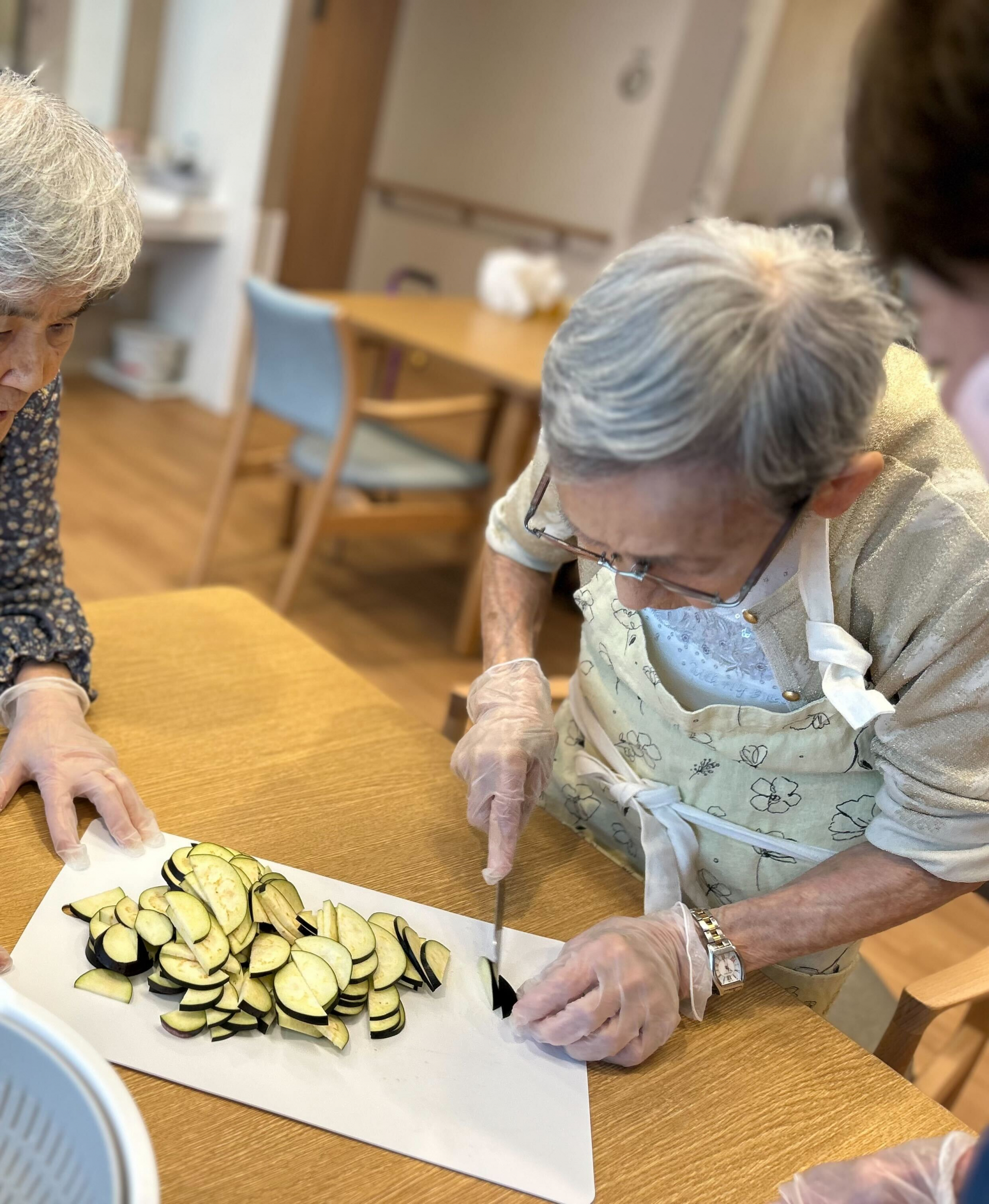 今回は、利用者様にも野菜のカットや盛りつけに参加していただき、皆で協力して作るランチタイムに。「包丁なんて久しぶりだけど、昔は毎日やってたのよ」「あら、私より上手!」といった和やかな会話が弾み、食事作りのひとときも、立派な交流の時間になります。