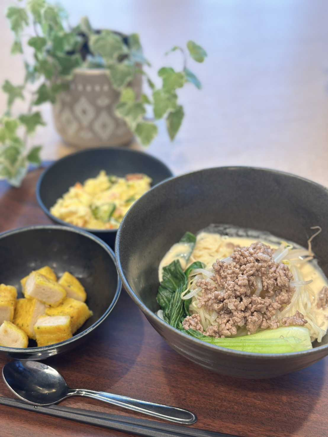 今回はスタッフ発案で、中華麺をアレンジした担々麺作りに挑戦しました。辛いくないやさしい味の担々麺です
