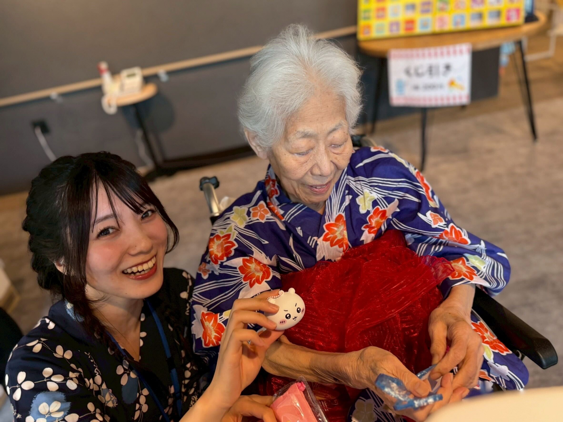 ご自身で選んだ色とりどりの浴衣を身にまとい、うちわを手に、屋台やゲームコーナーを巡る姿はとても生き生きとしていて、私たちスタッフにとっても胸が温かくなる光景でした。中でも大盛り上がりだったのは、手作りの“ガチャガチャコーナー”。