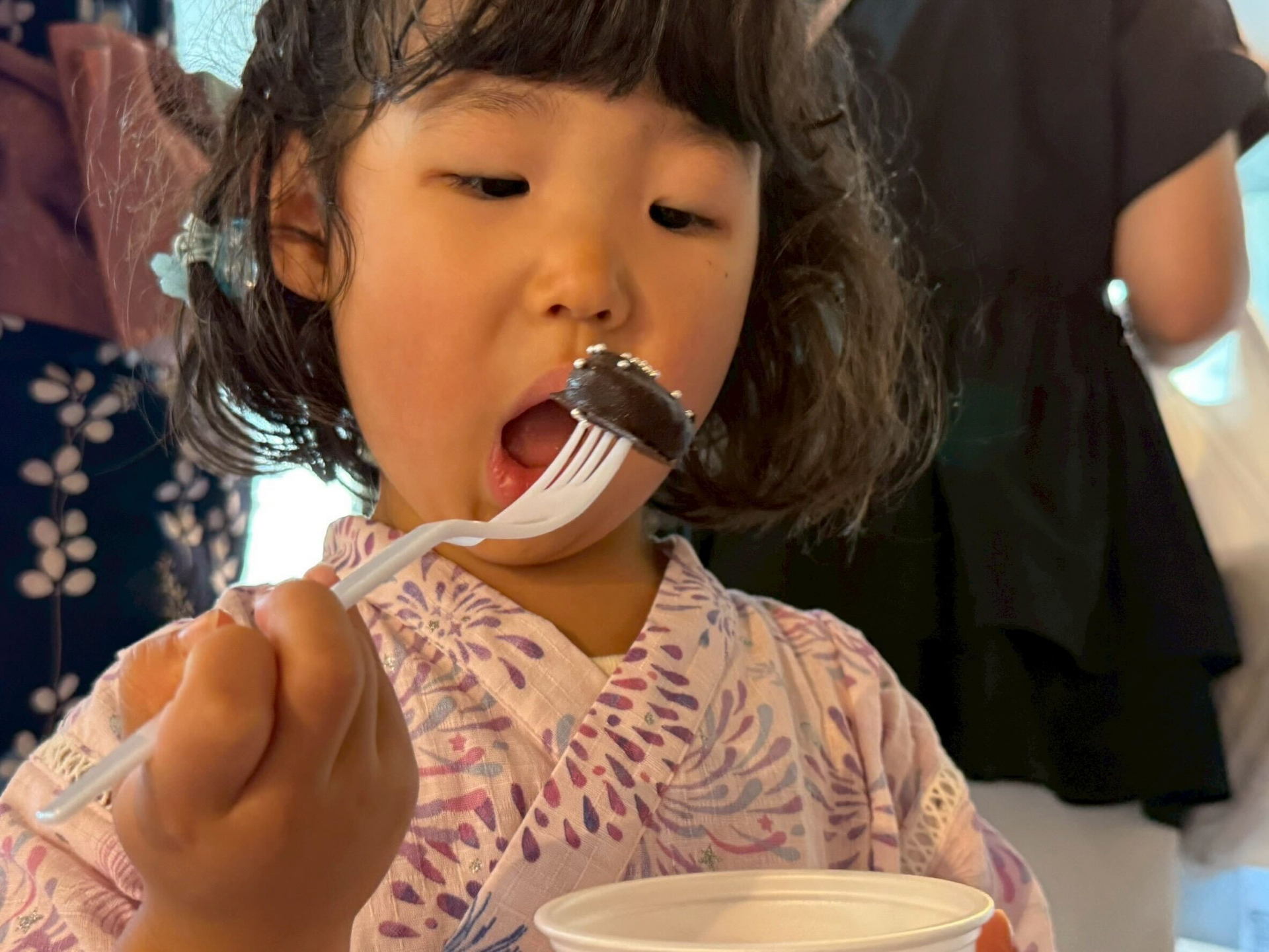 そして屋台からは、甘くて香ばしいチョコバナナの香り。「おいしい!」と笑顔!!