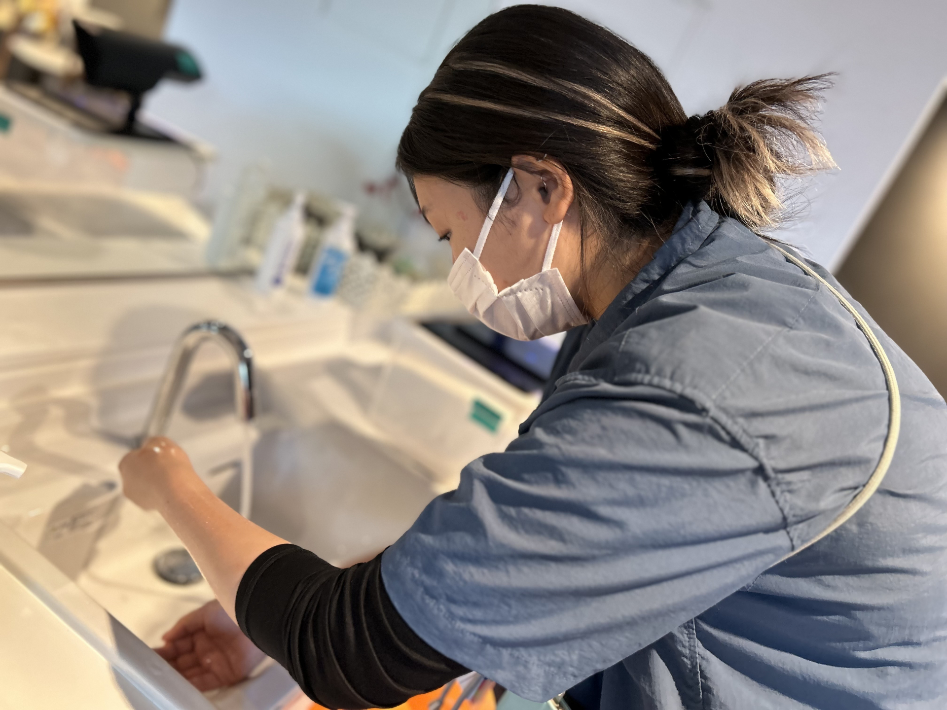 感染症予防の基本である「正しい手洗い」を改めて確認し、手順や洗い残しが起こりやすい箇所についても、実際に手洗いチェッカーを使用してチェックを行いました。