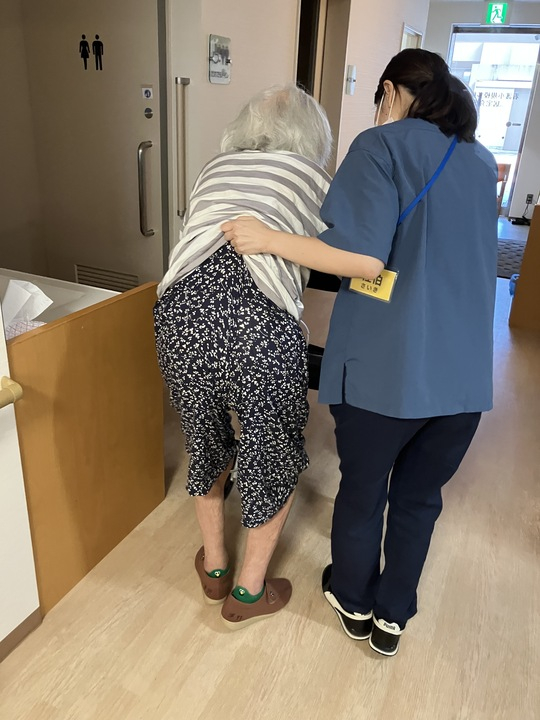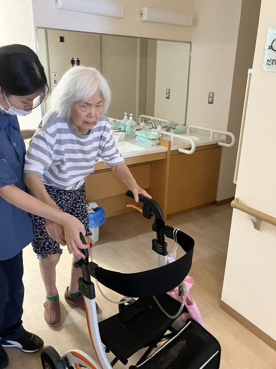 上の写真ではわかりにくいですが、歩行器で歩いている場面。退院して看多機にきた方です。