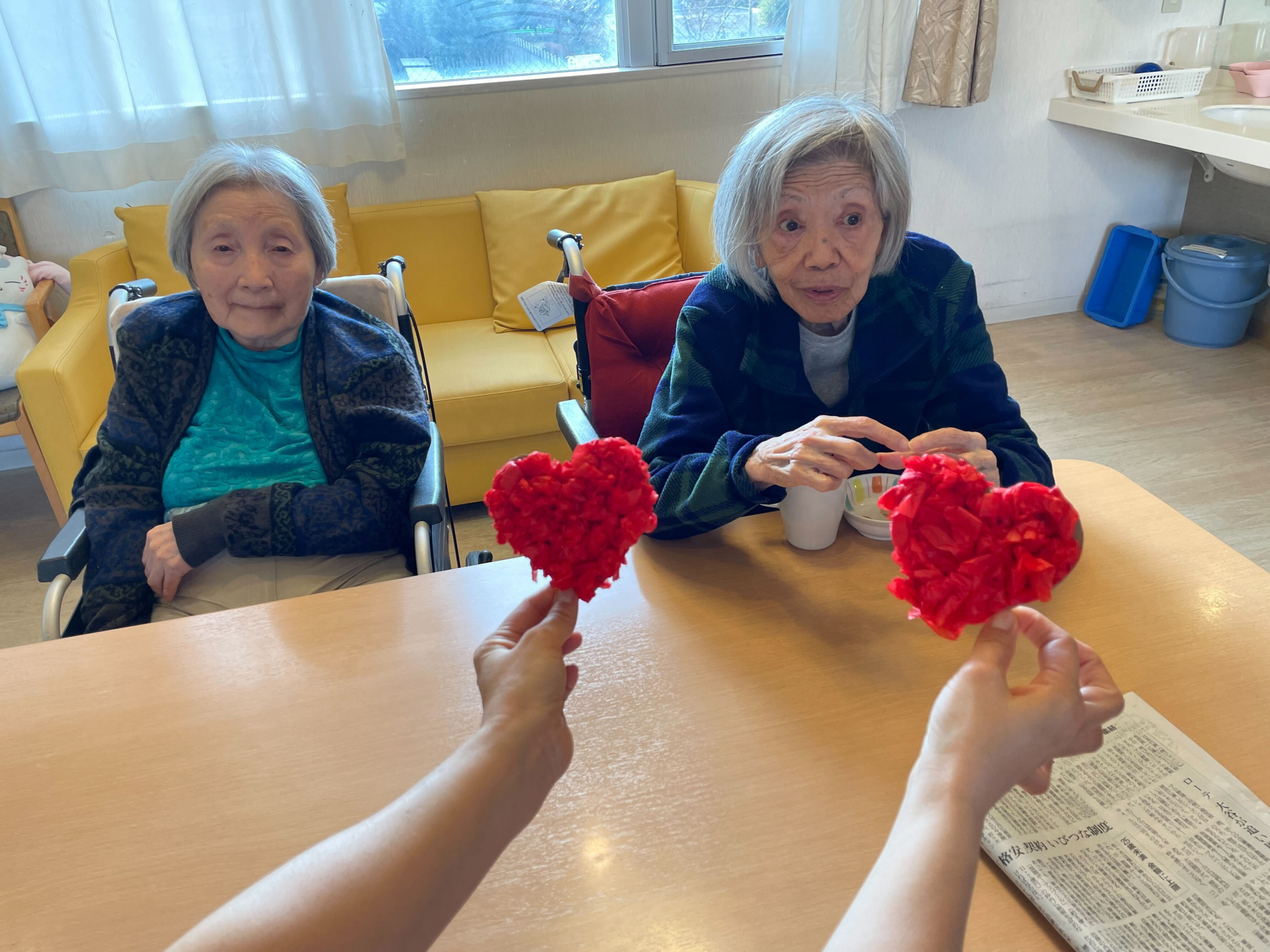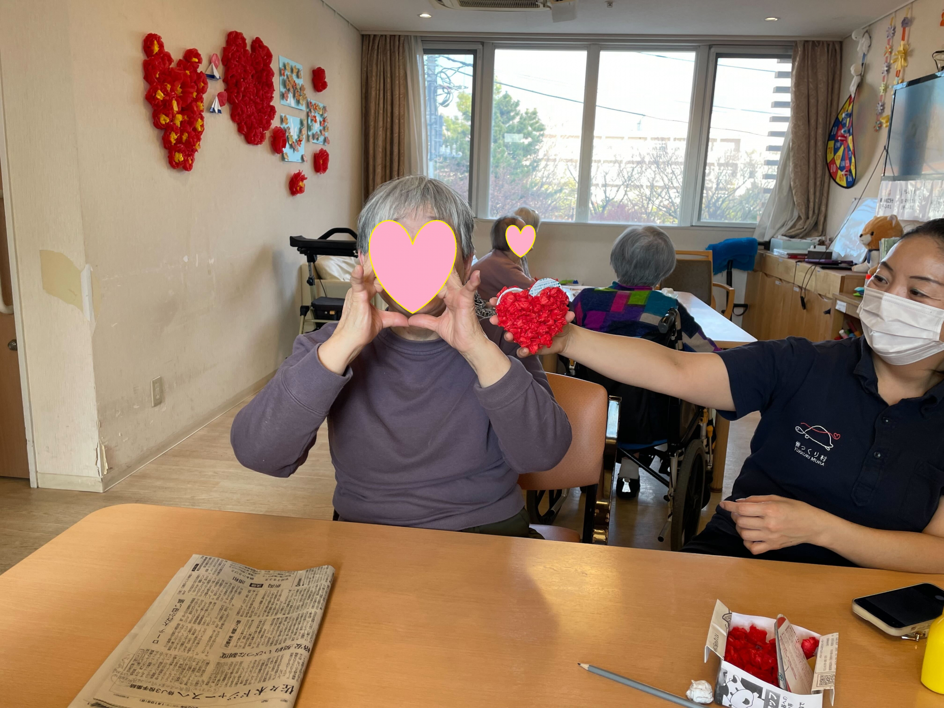 職員と一緒にハートを作り壁面飾りが完成(^_-)-☆