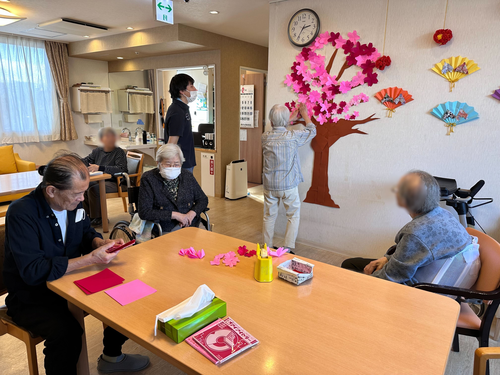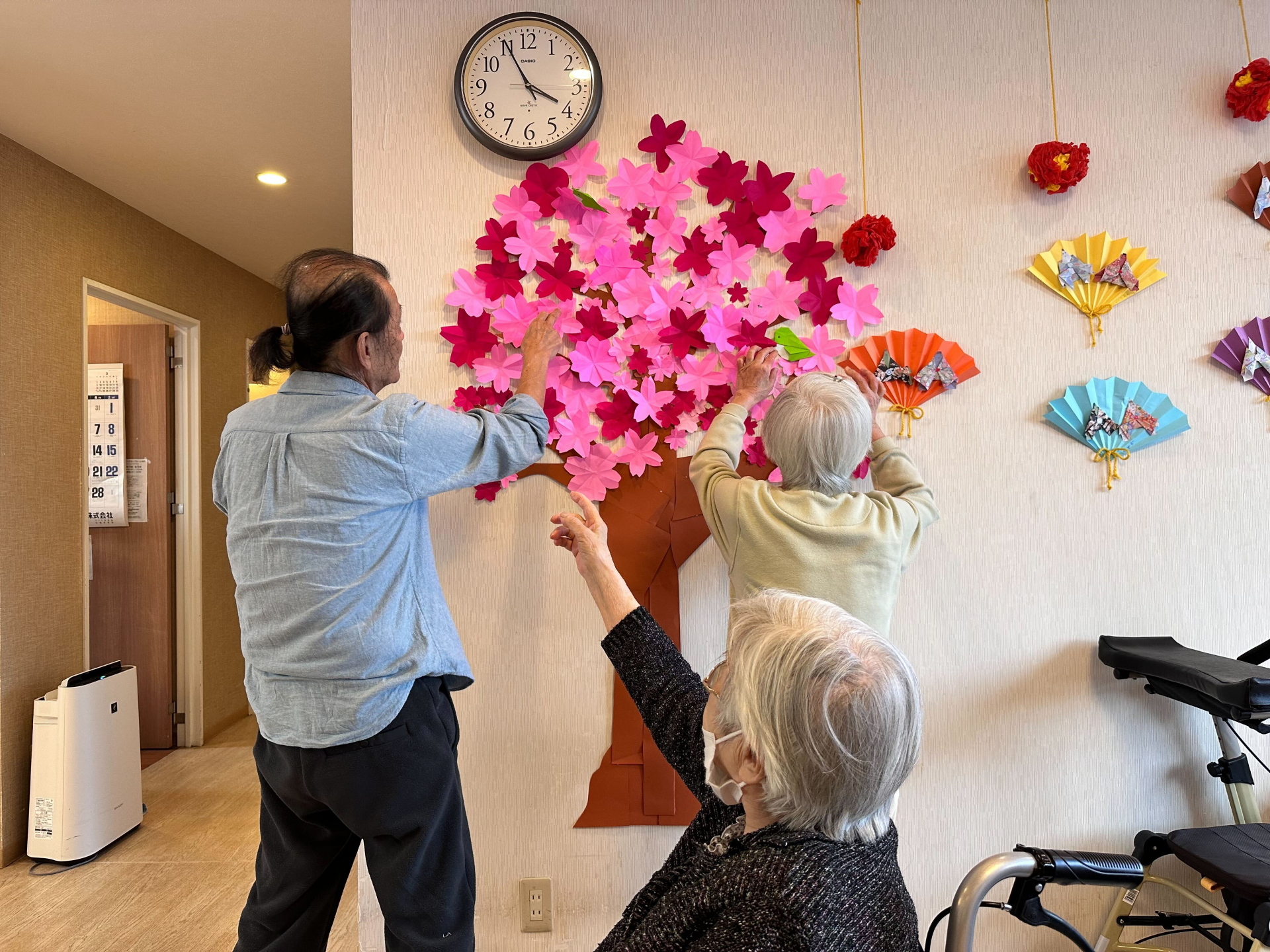 今日は一足先に桜を咲かせよう。という事で、壁に桜の飾り付けを皆さんで作った様子をお届けいたします。