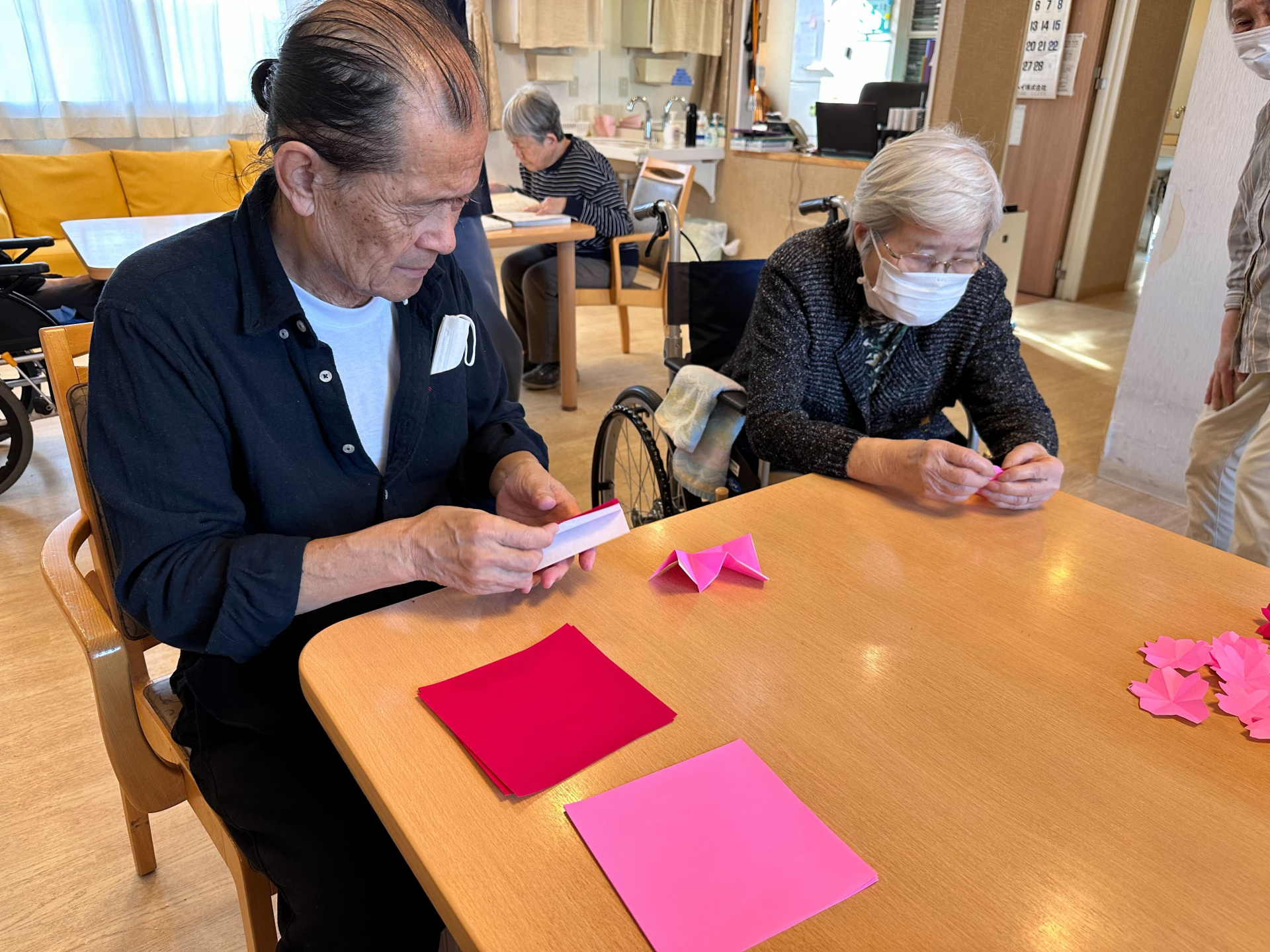 折り紙を使って、桜の花びらを作ります。折って畳んで切り取って、手分けをして作りました。