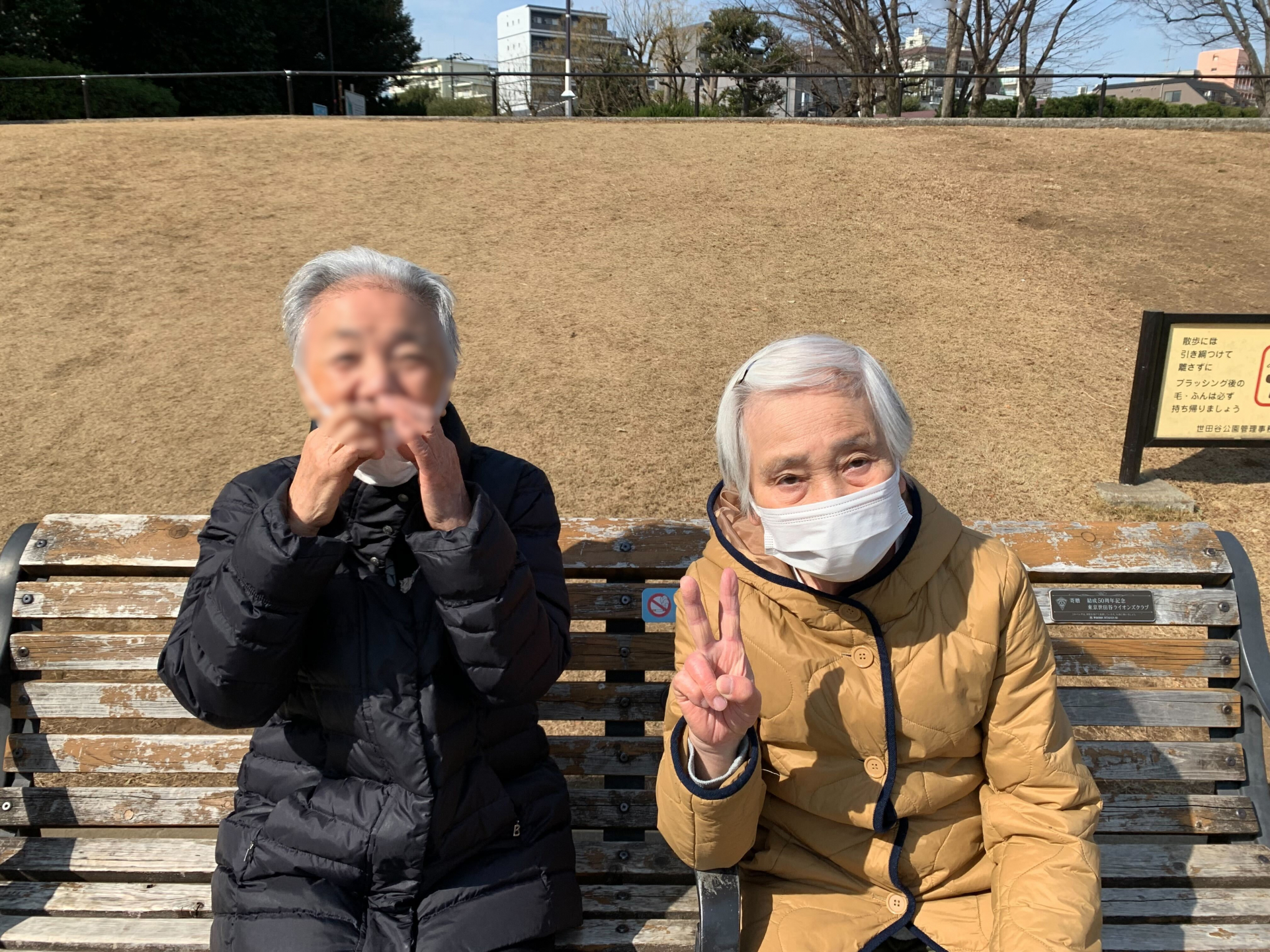 こちらは暖かい日向のベンチで一休み。いい季節になってきました。