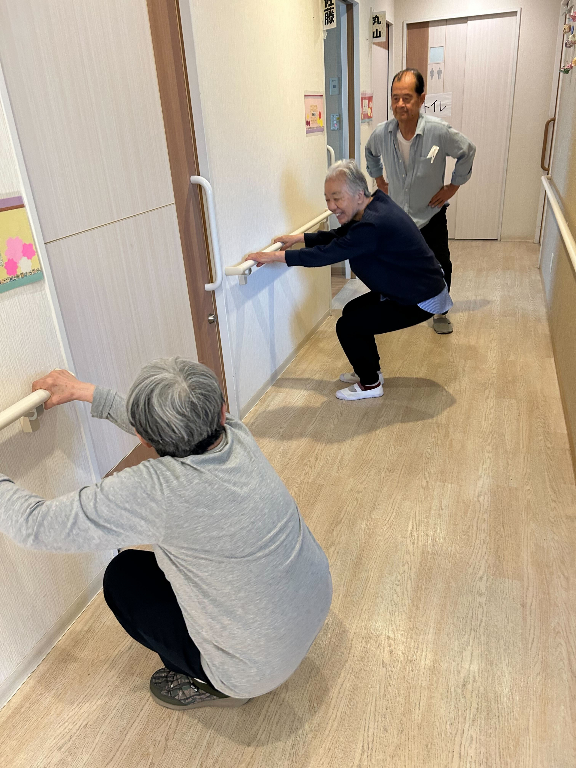 フロア内を歩いたり、手すりを使ってスクワットをしたり