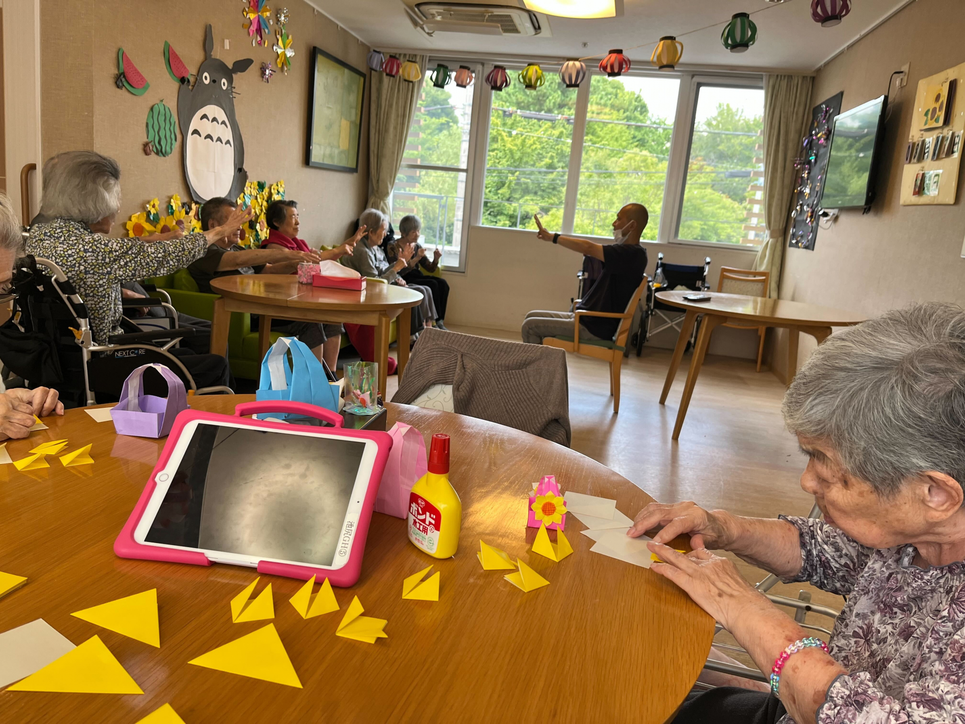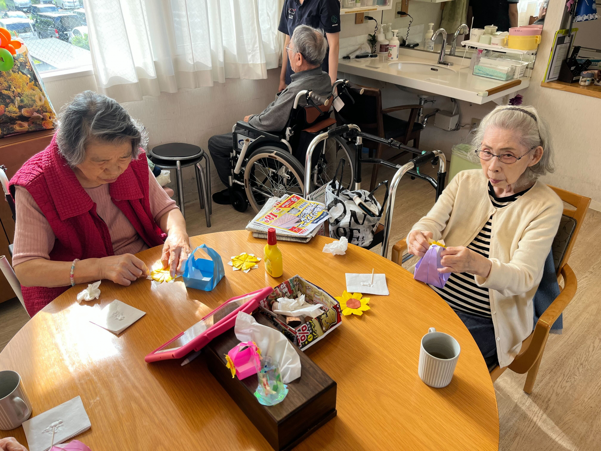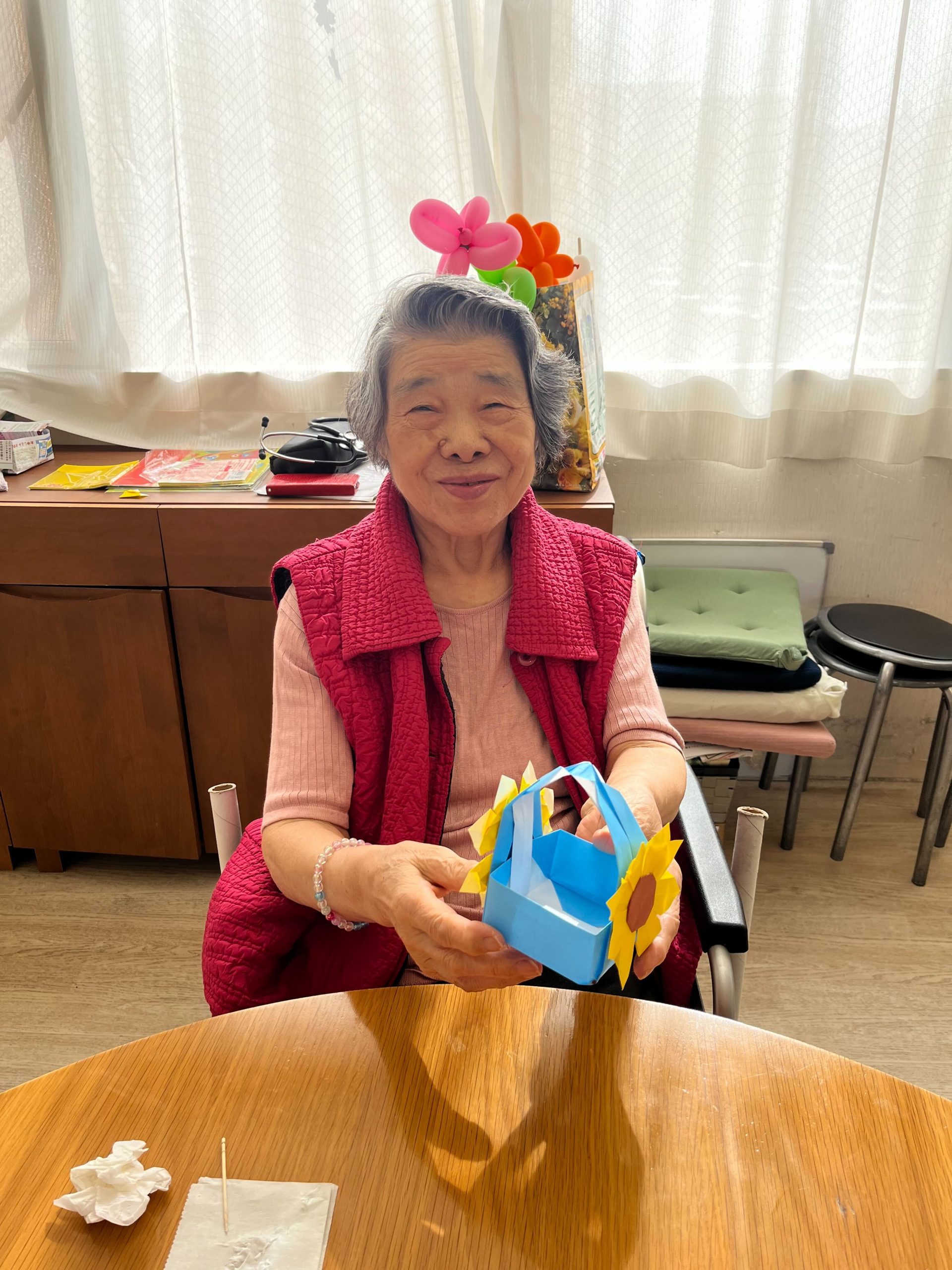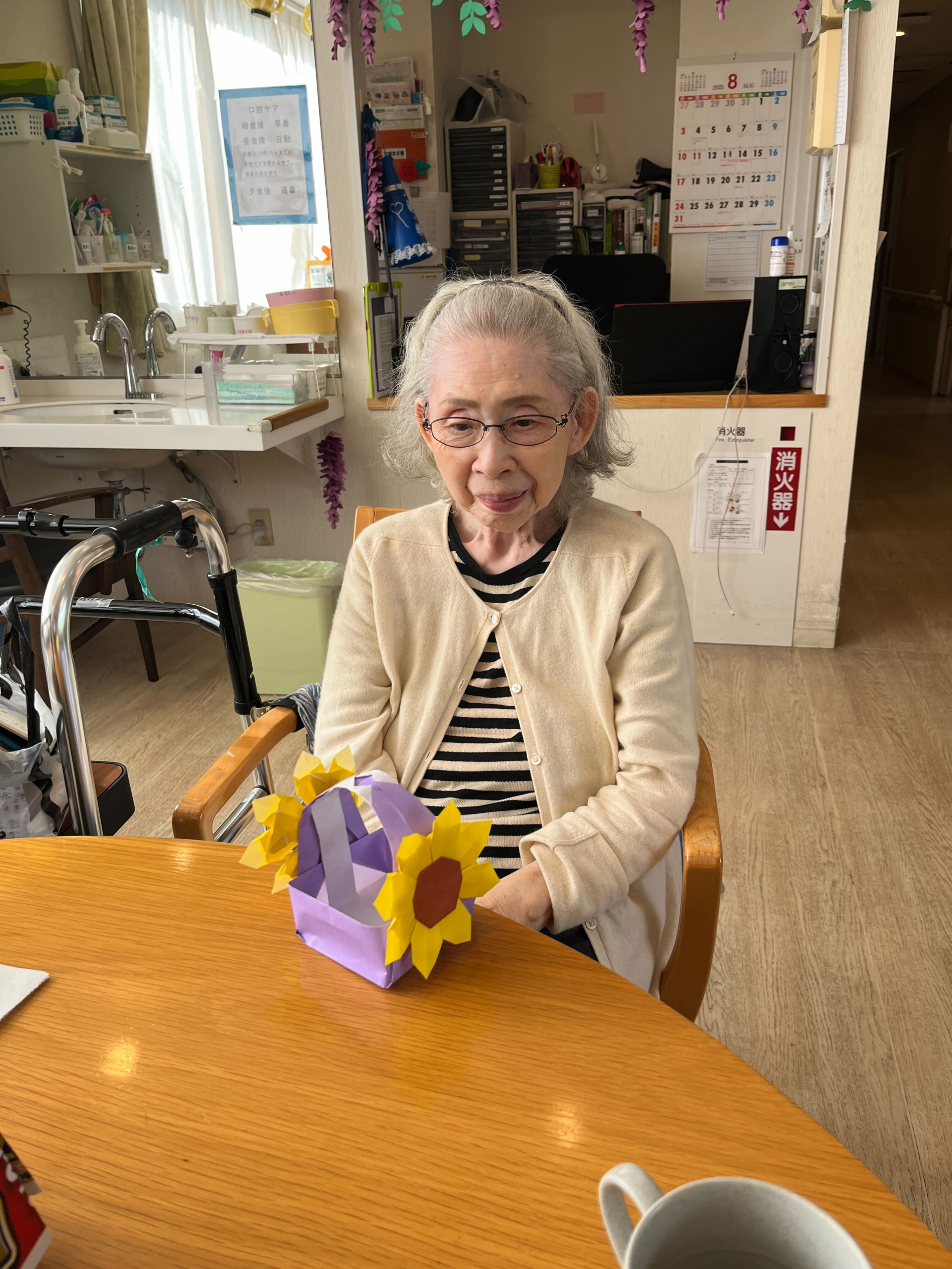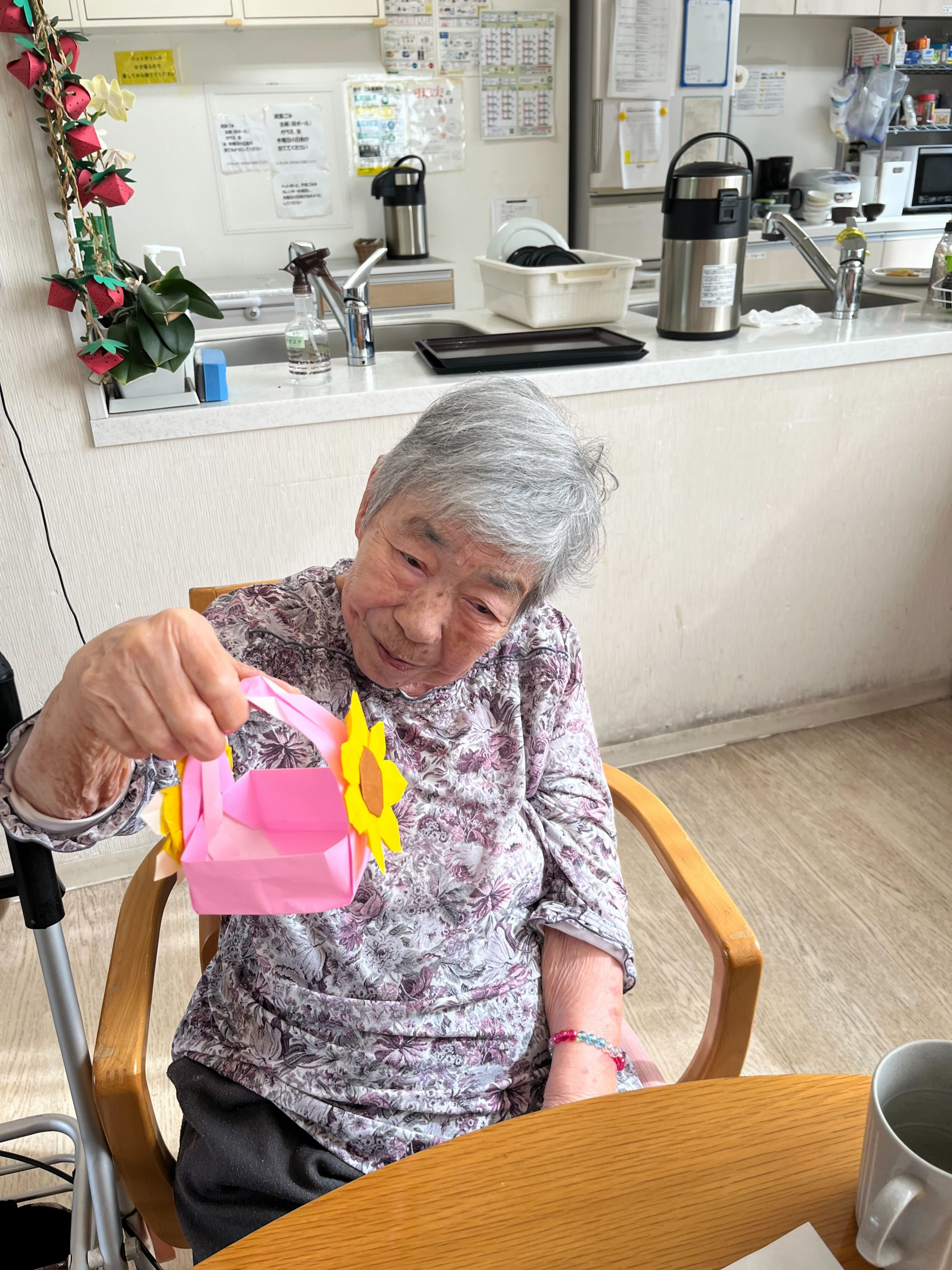 皆様お久しぶりになってしまい申し訳ありません。毎日雨ばかり。梅雨が戻ってきたみたいで、どんよりした気分になってませんか?元気にいきましょう!本日は体操と折り紙。さて今日のご利用者様はどんな表情でしょうか?