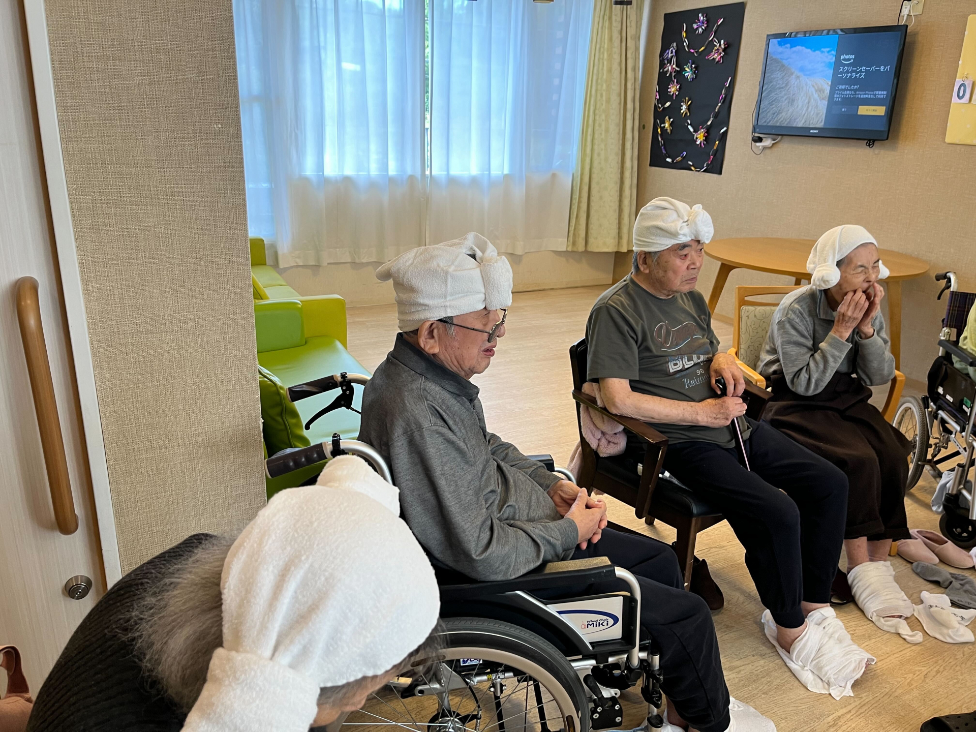 また優っくり足湯に来てくださいね!いつもは「手が無理だからできねぇ」と言っていたO様も、左手で一生懸命にタオル巻きに参加してくれました!Y職員より
