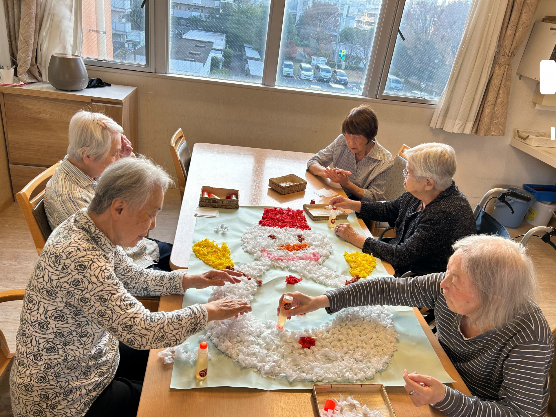 皆様と一緒に壁面飾りの雪だるま制作をしました。