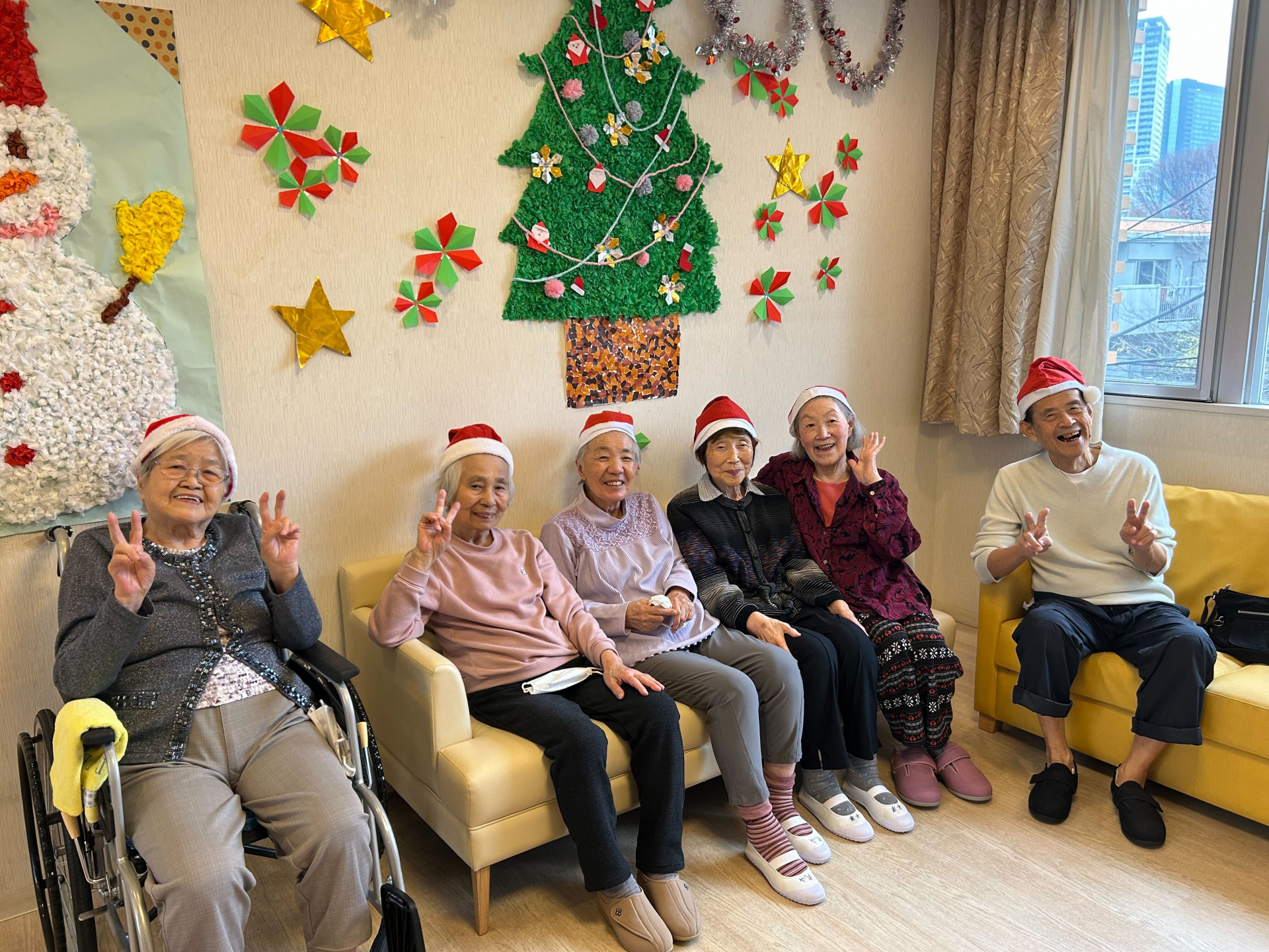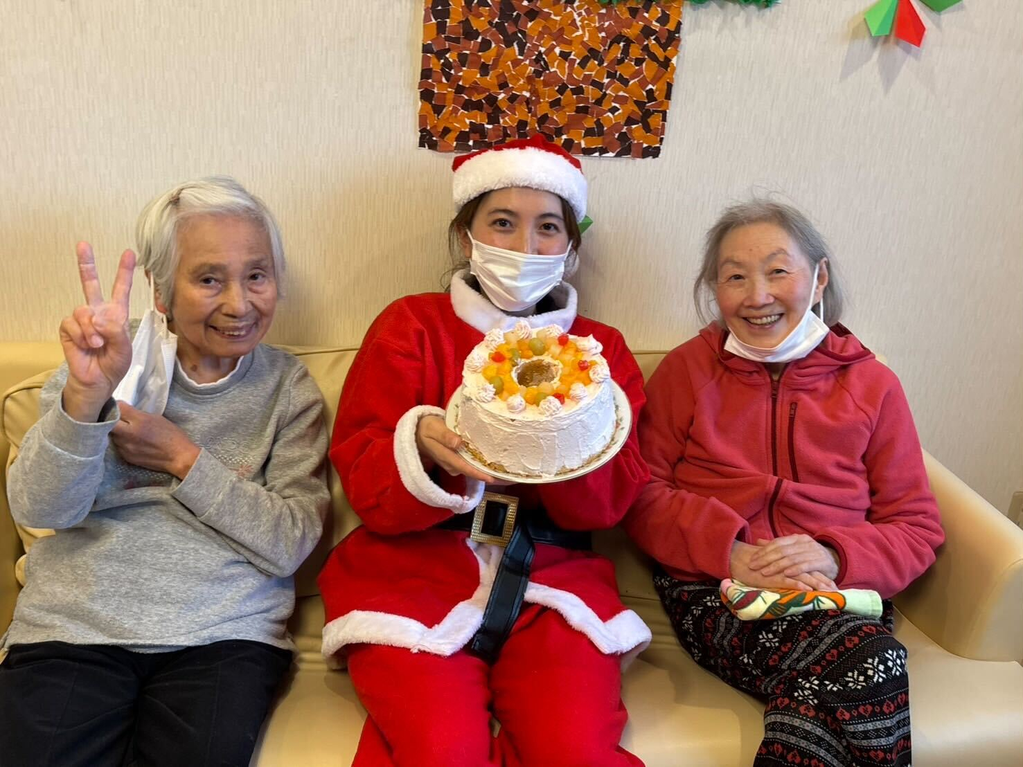 サンタさんの帽子を被って皆さんで写真取りました、その後おやつもいただきました。