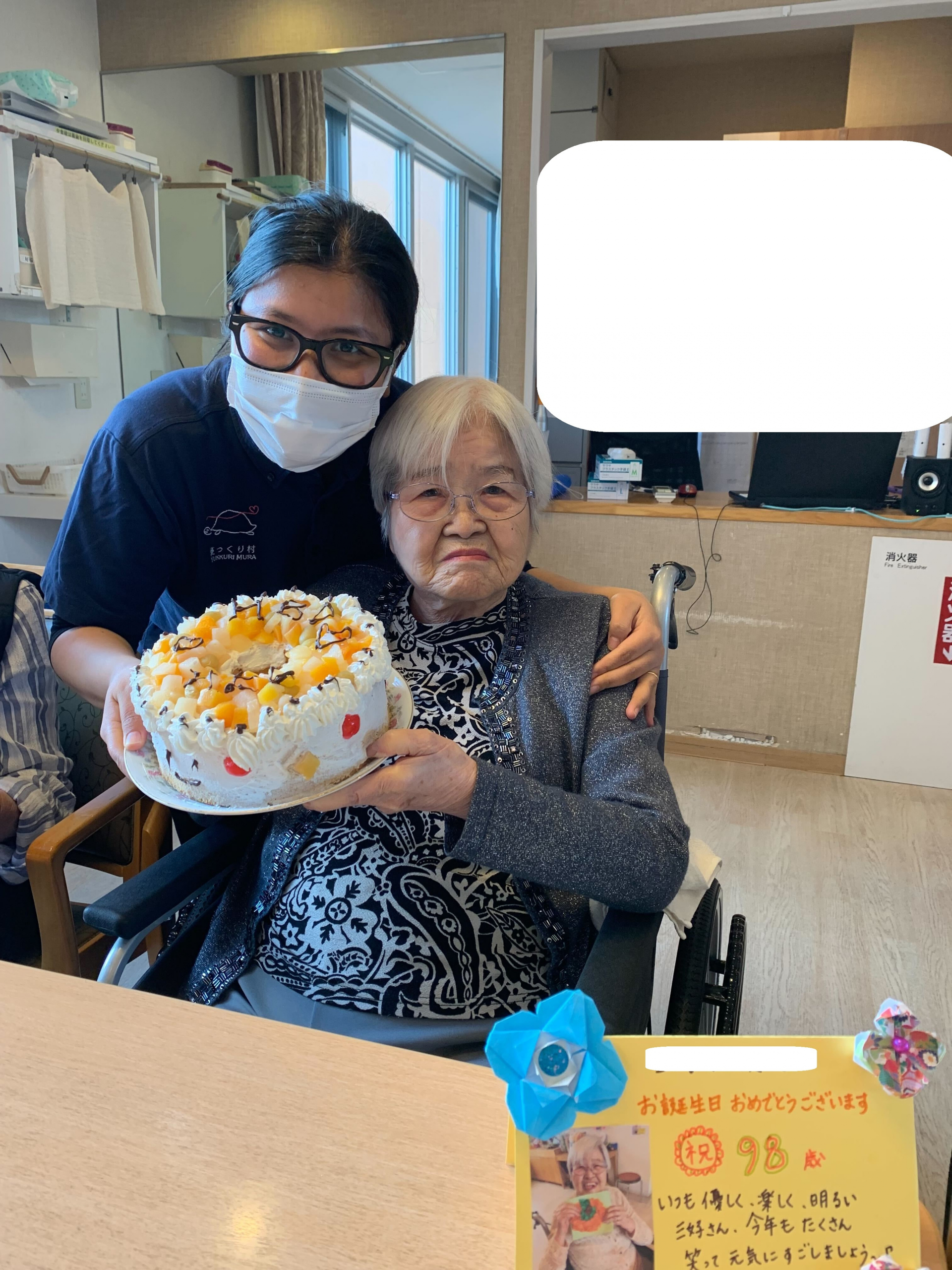 M様は、大きな声で「ありがとうございます」と皆さんに話され大変嬉しそうな様子。あと2年で100歳‼と自分でビックリしていた。