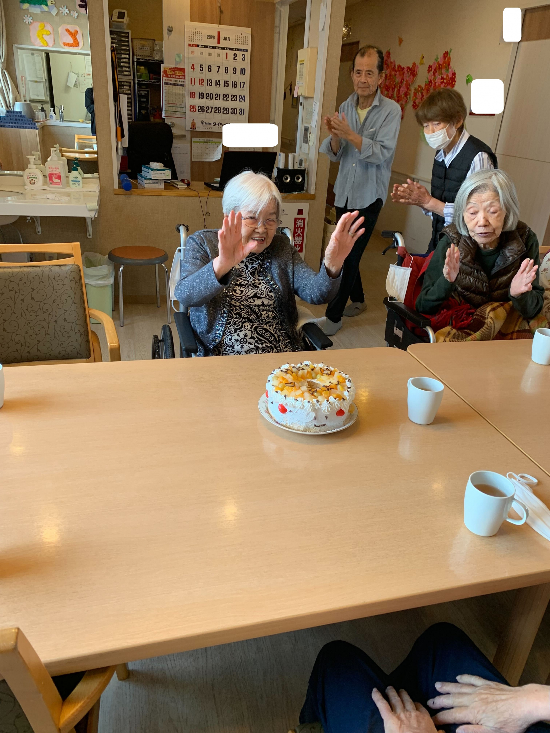 M様の誕生日会を行いました。職員手作りのケーキと歌でお祝いをしました。新年早々おめでたいね〜。98歳すごいね〜。などなど、皆さん楽しくお話しされていた。