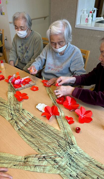 【グループホーム世田谷】池尻3F 2月の壁飾り~梅と鶯~