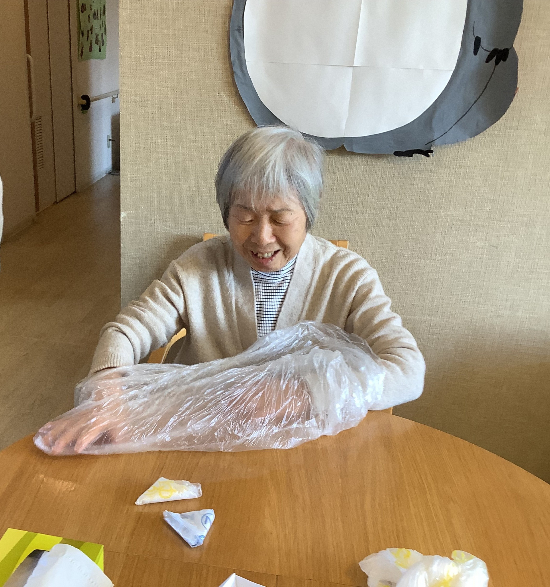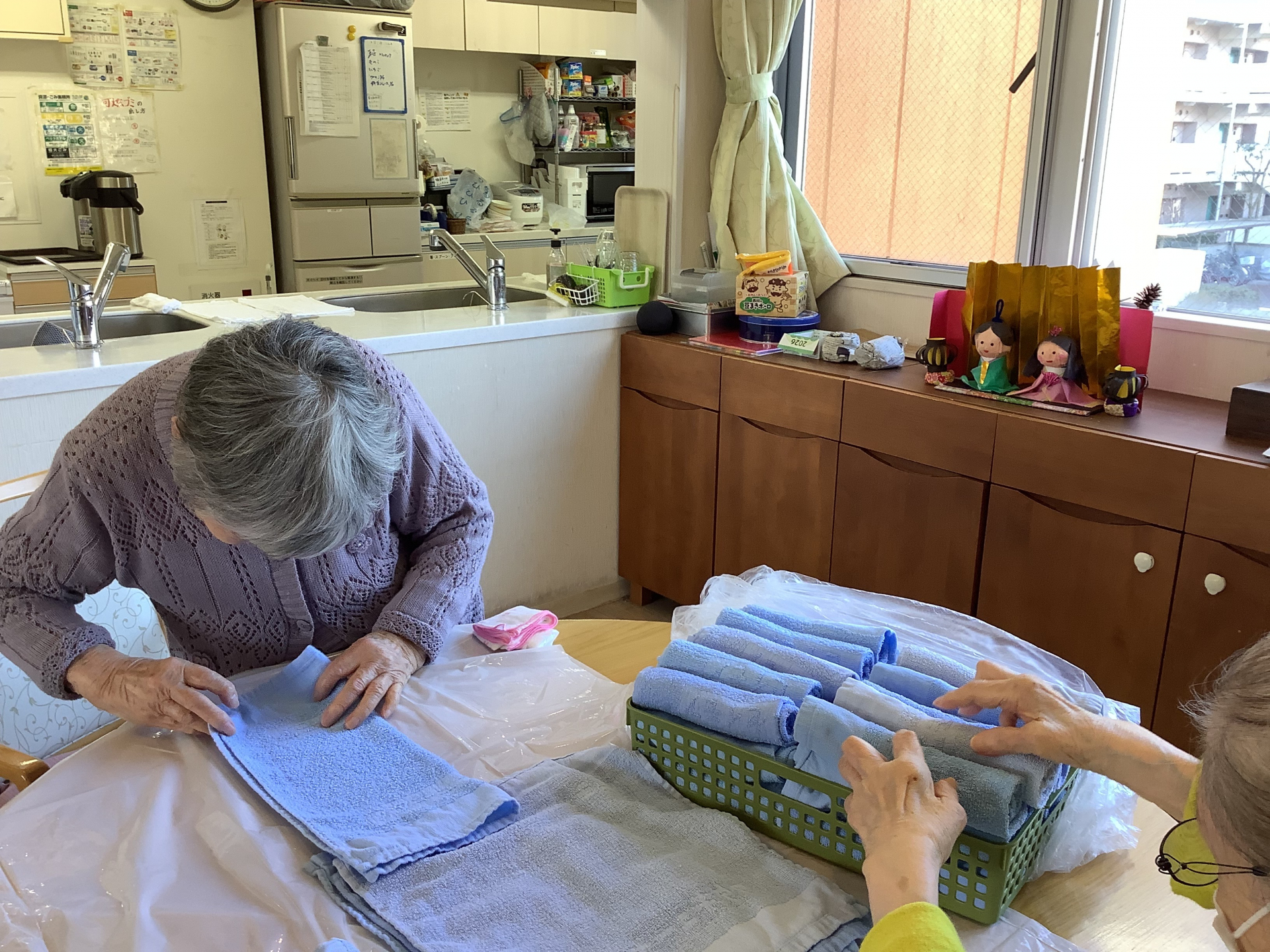 タオルたたみ・ビニールを三角△にたたんでもらったりしました。