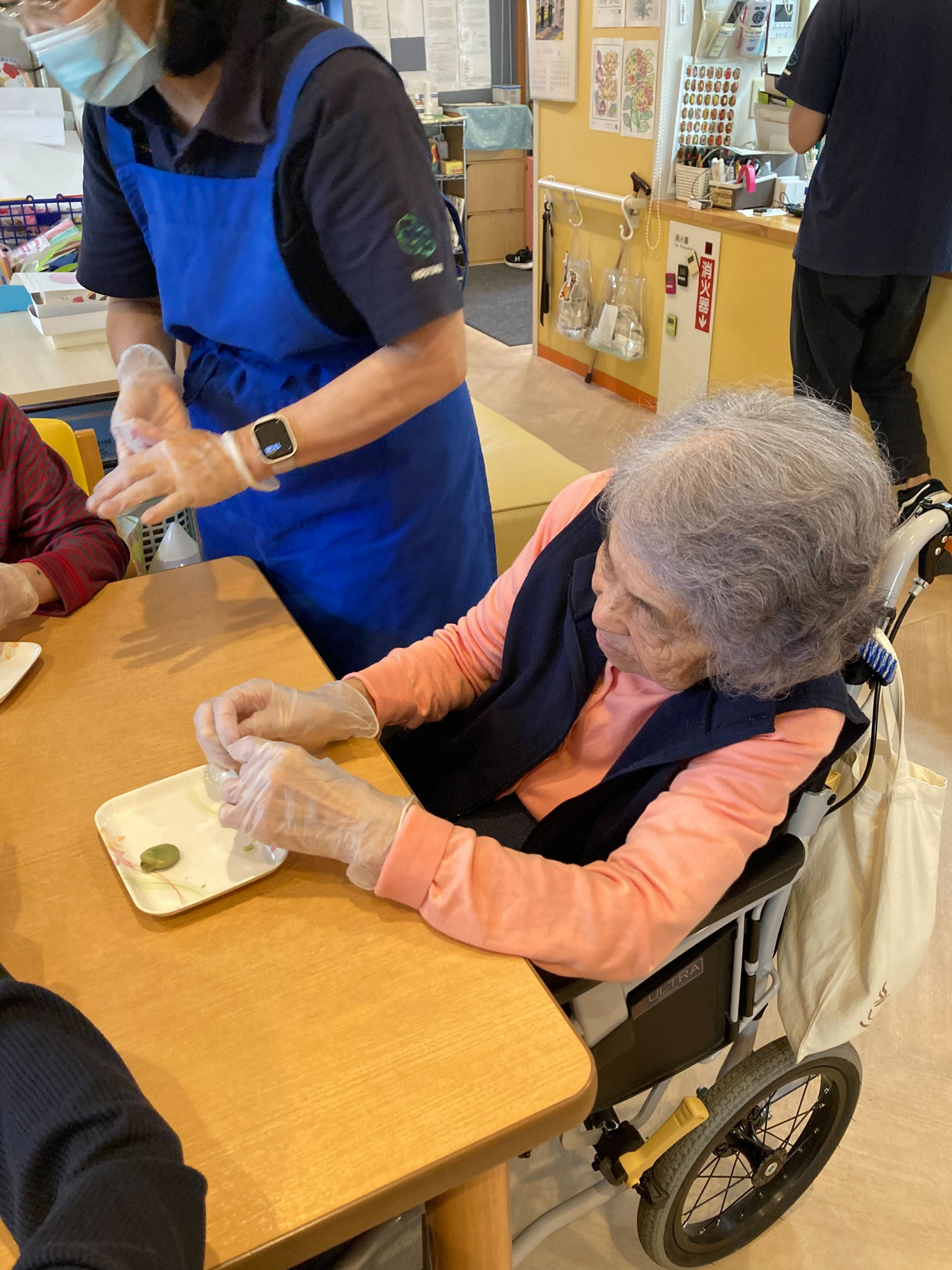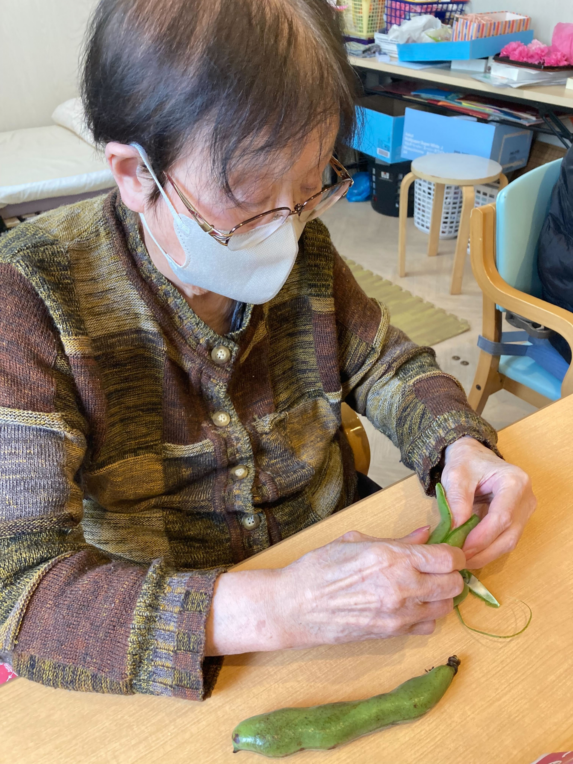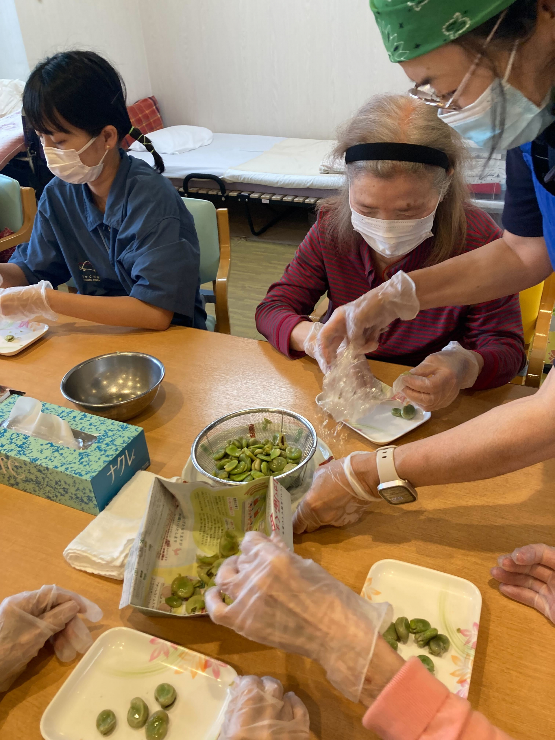 職員もご利用者様も一緒になってそら豆剥きに集中されていました(^o^)丿