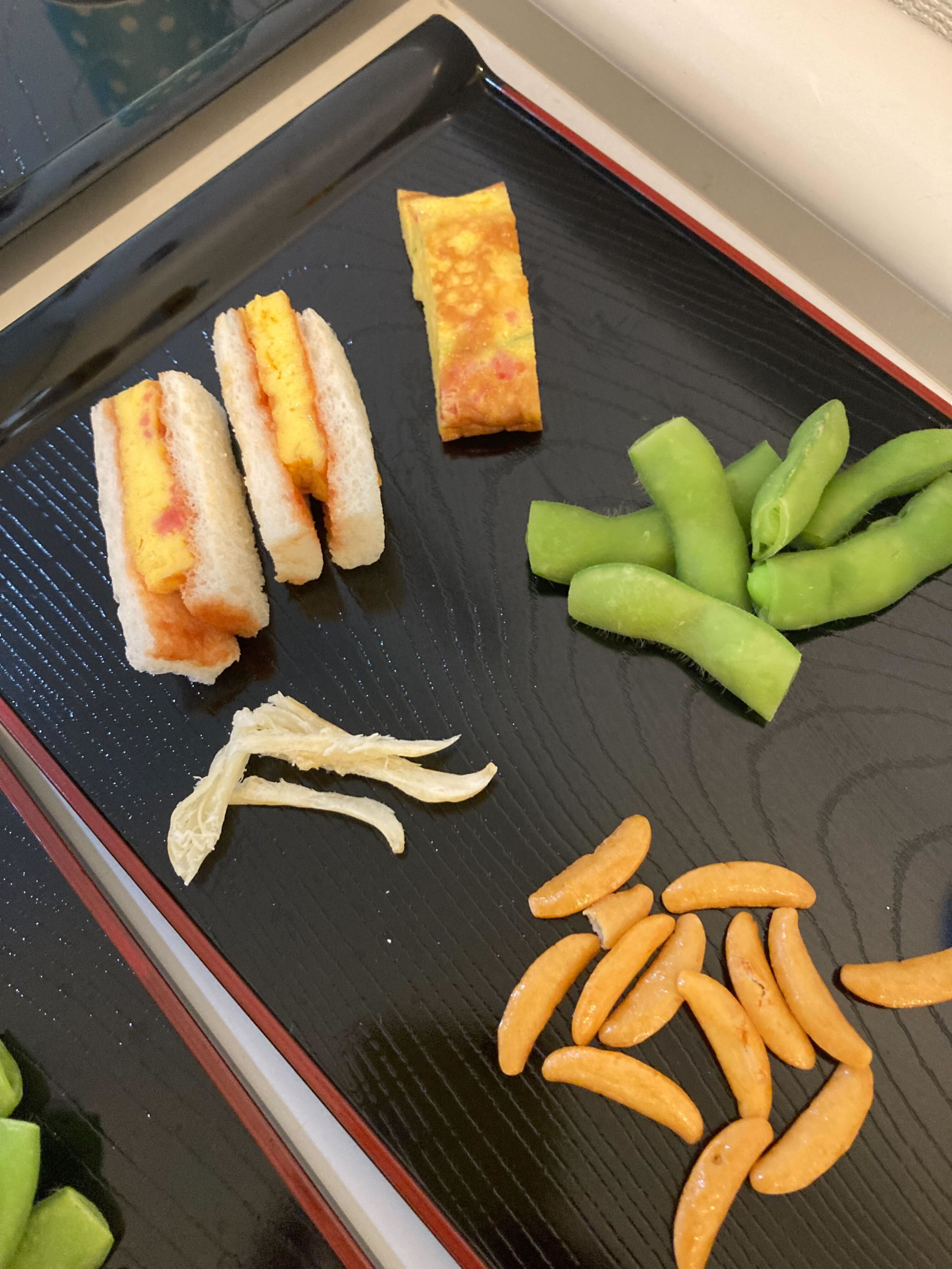 おつまみとしては前回人気だった枝豆と柿の種の加えて小さめのたまごサンドをお出ししました(^o^)丿