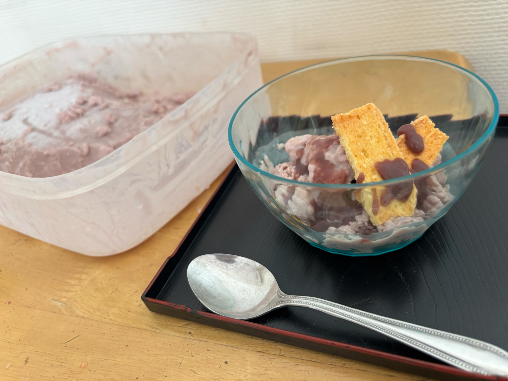 小豆とヨーグルトを冷凍し、小豆ヨーグルトアイスを事前に作りおやつの時間にお出ししました!!