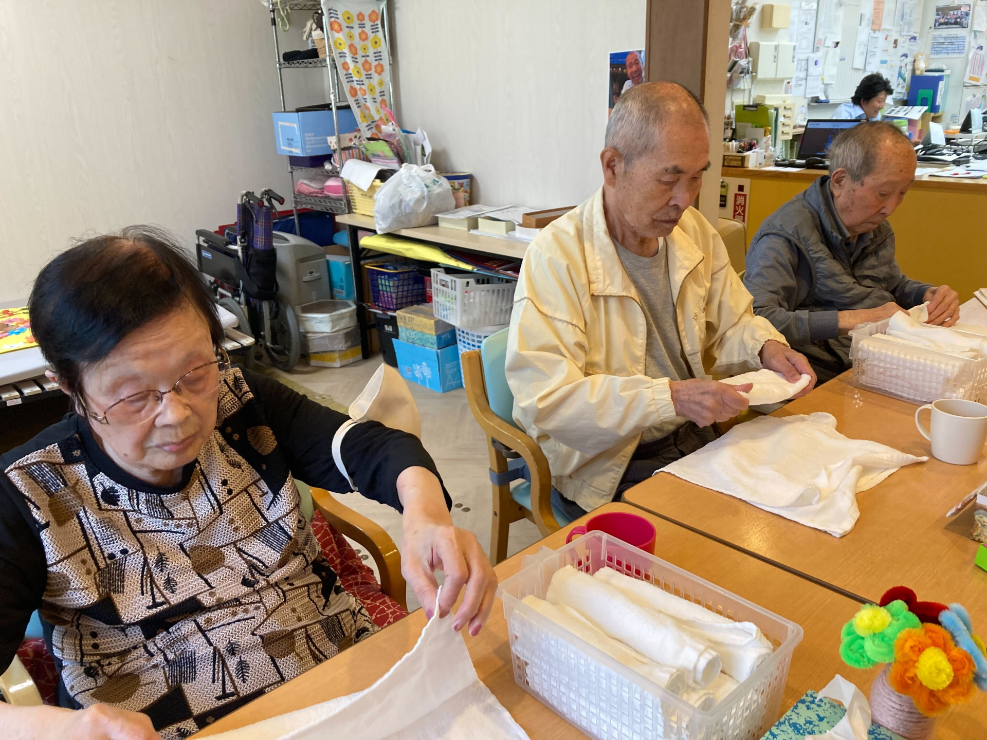 【介護 お手伝い】皆様仲良くおしぼり畳みm(_ _)m