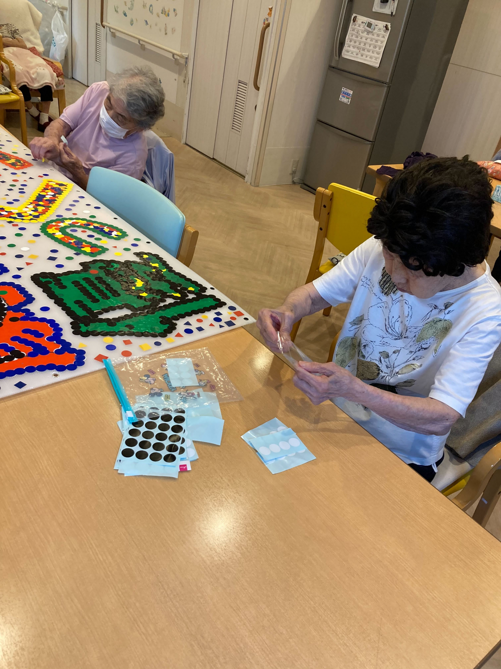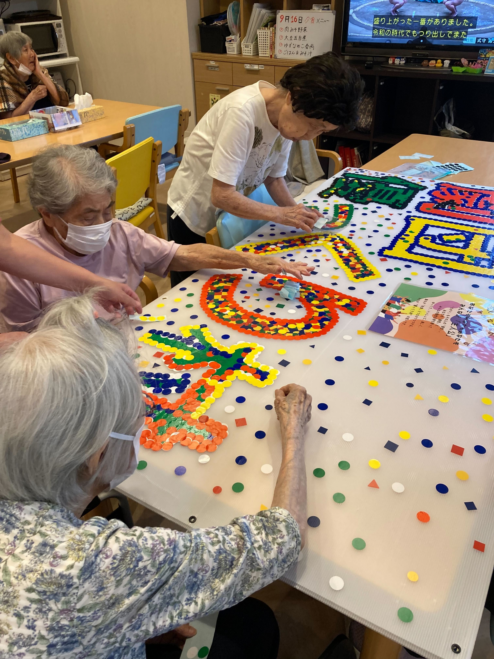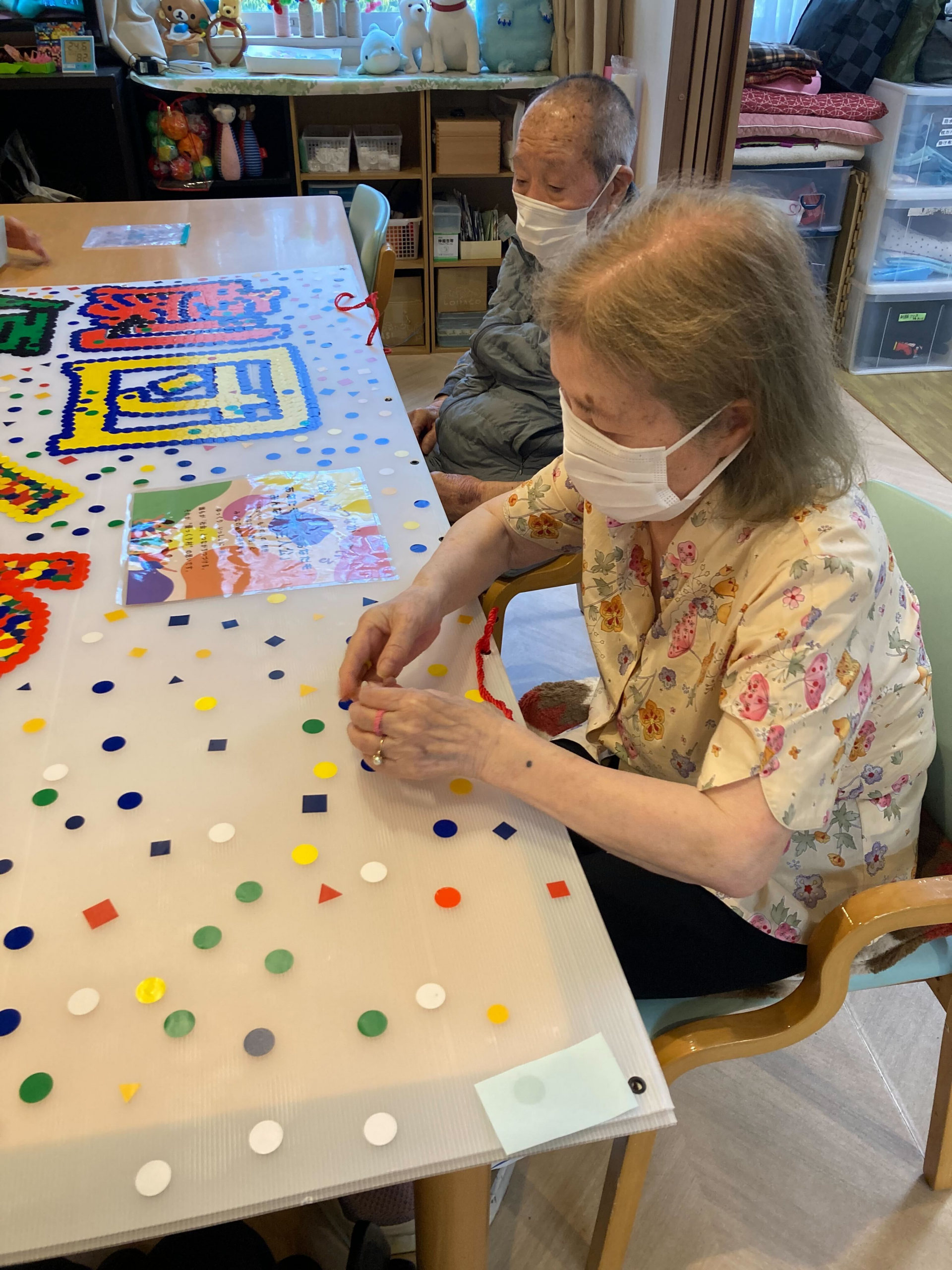 大きな文字の中に色鮮やかなシールを貼りつけています!!