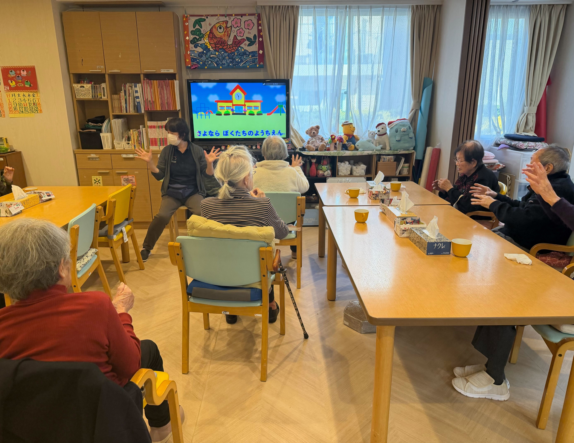職員の声かけに合わせて、手足をゆっくり動かしながら参加されています。