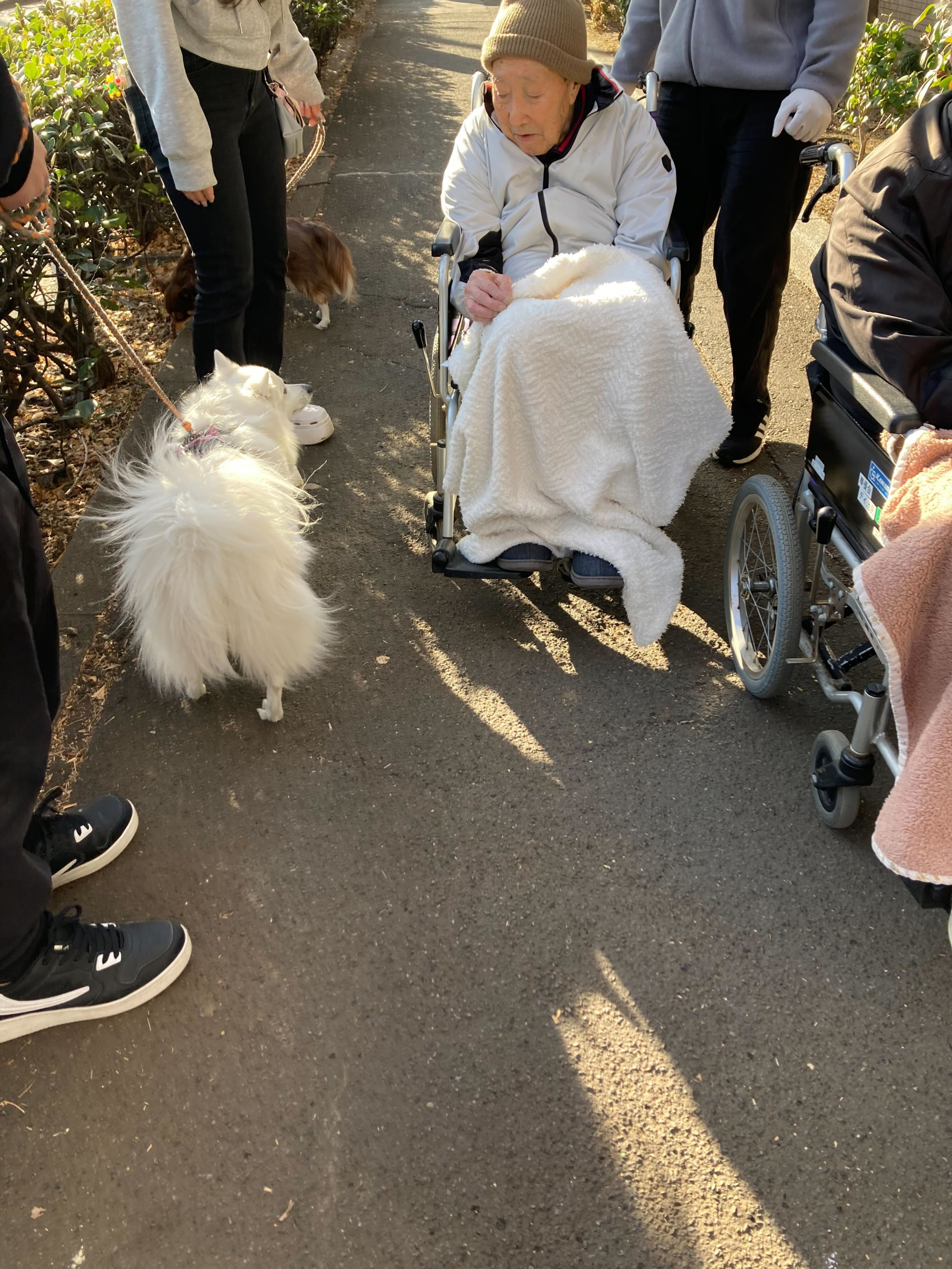 道中でかわいいわんちゃんに出会い、「かわいいね」と笑顔で見つめておられ、とても喜ばれていました。
