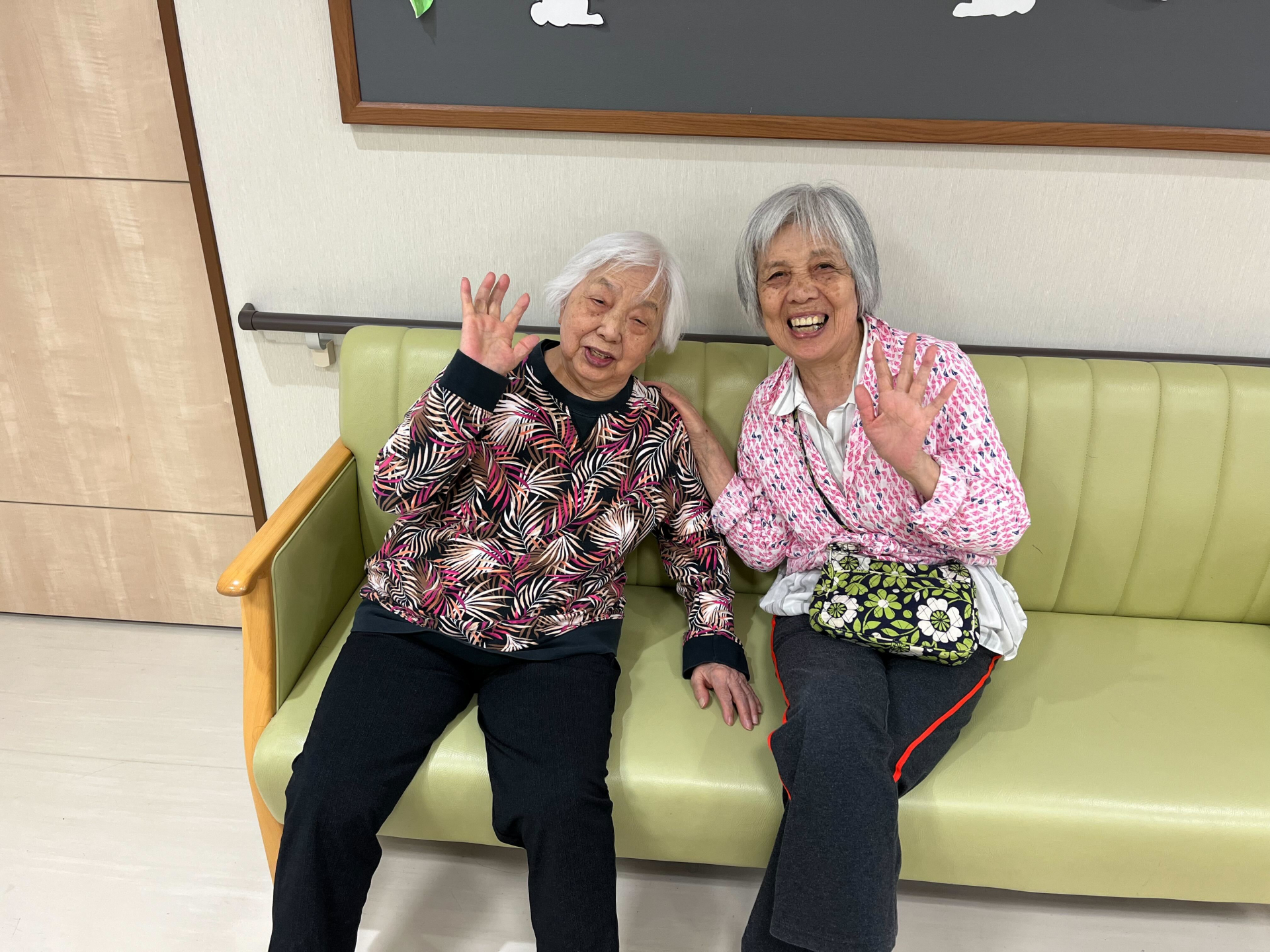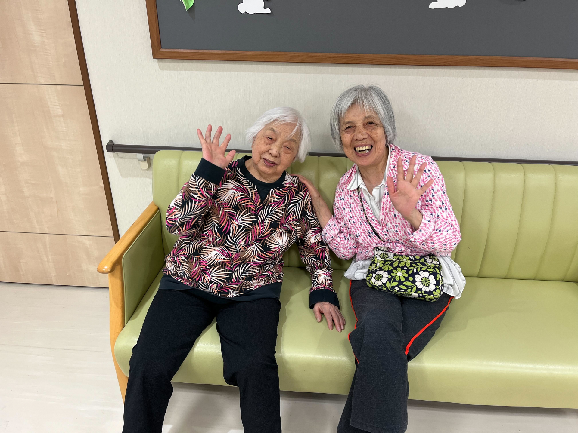 今日のおやつの前にお二人がソファで座りながら楽しく話しています。