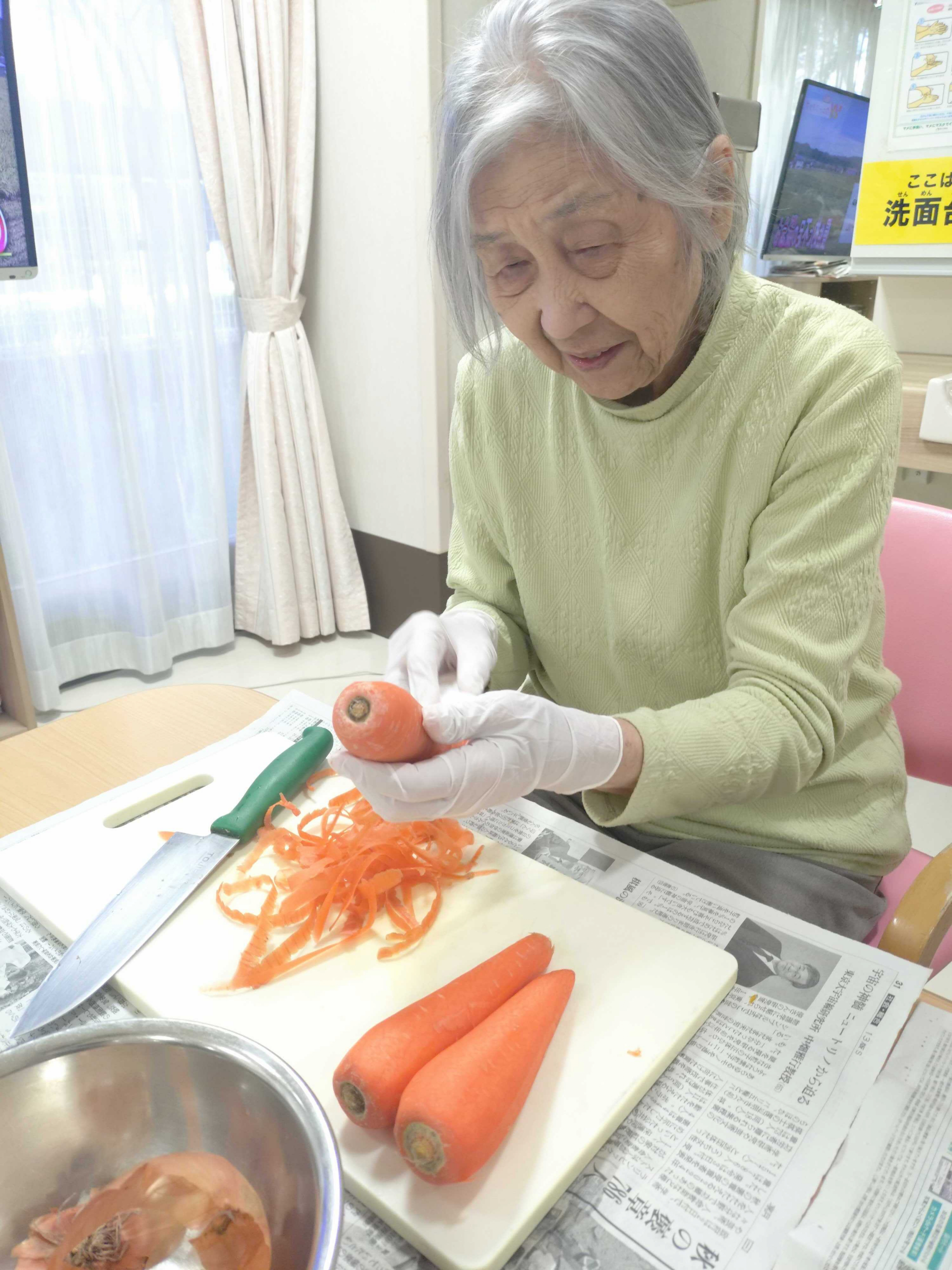 皆さんに玉ねぎ、人参、なす、ジャガイモ等を切ってもらいましょうー