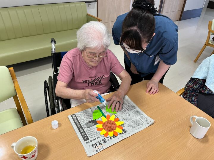 工作で作ったヒマワリを並べて、壁絵を作ります!
