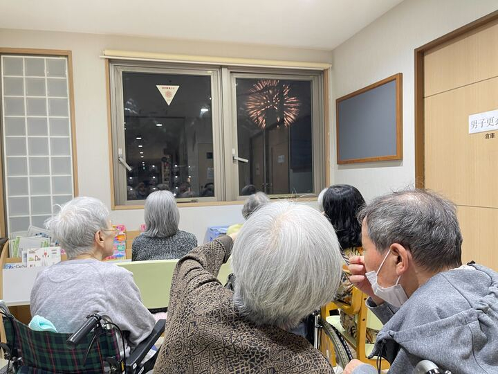 大きな窓の前に大集合して、皆で花火を楽しみました♪