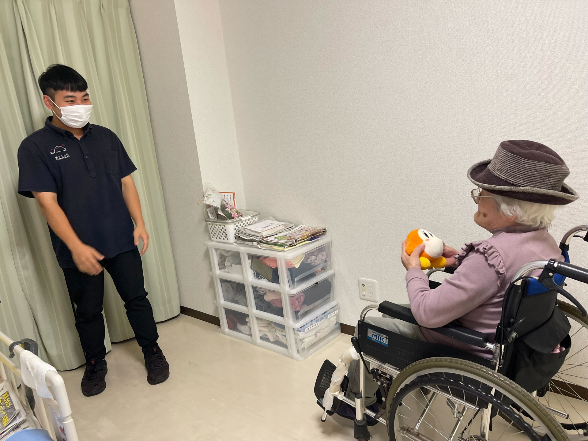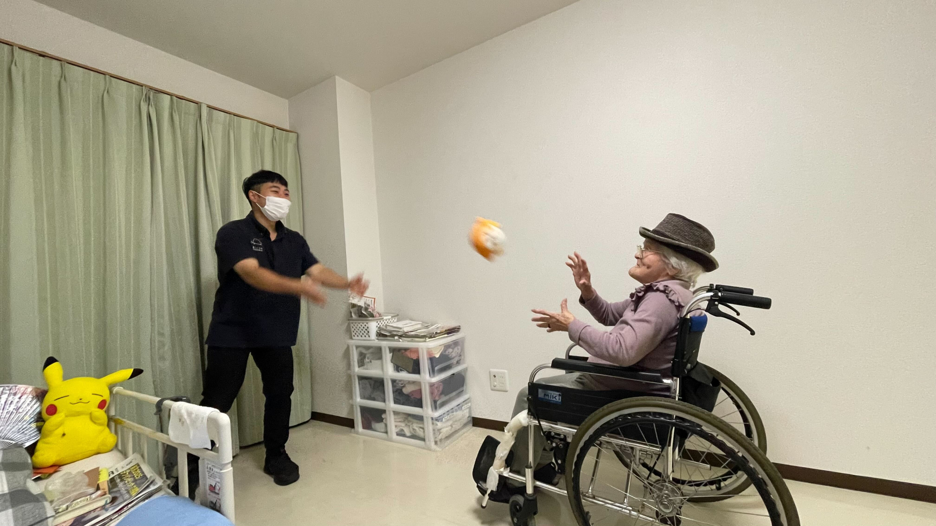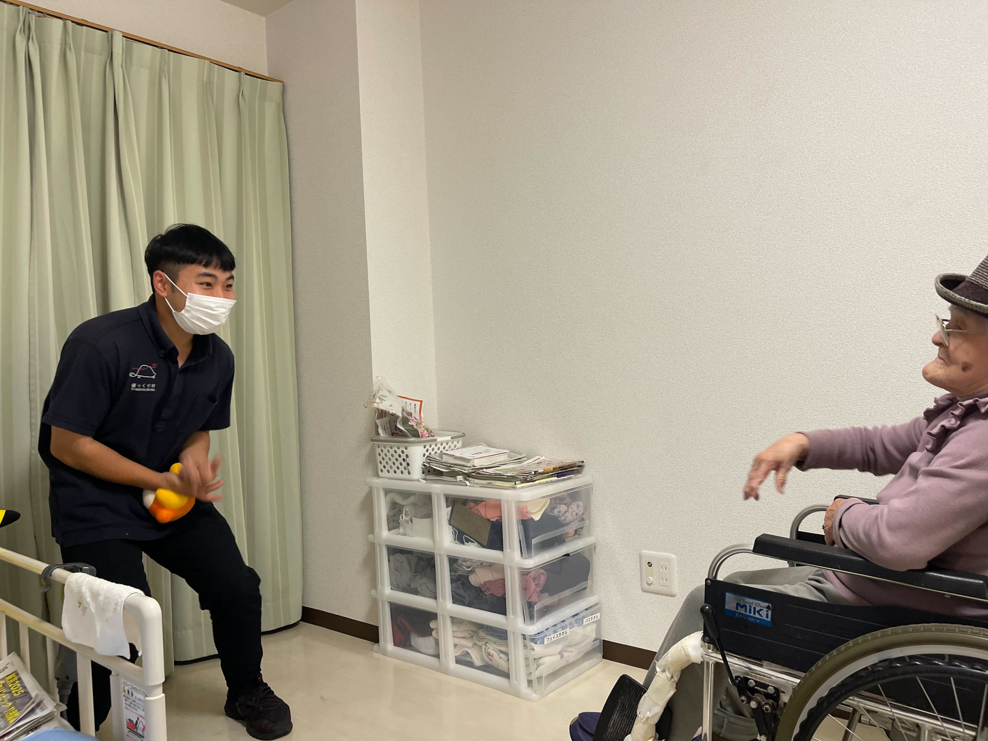 見に行ったら、お二人が遊んでいました。入居者様が帽子をかぶって人形で投げボールをしました。とても楽しそうなお二人。