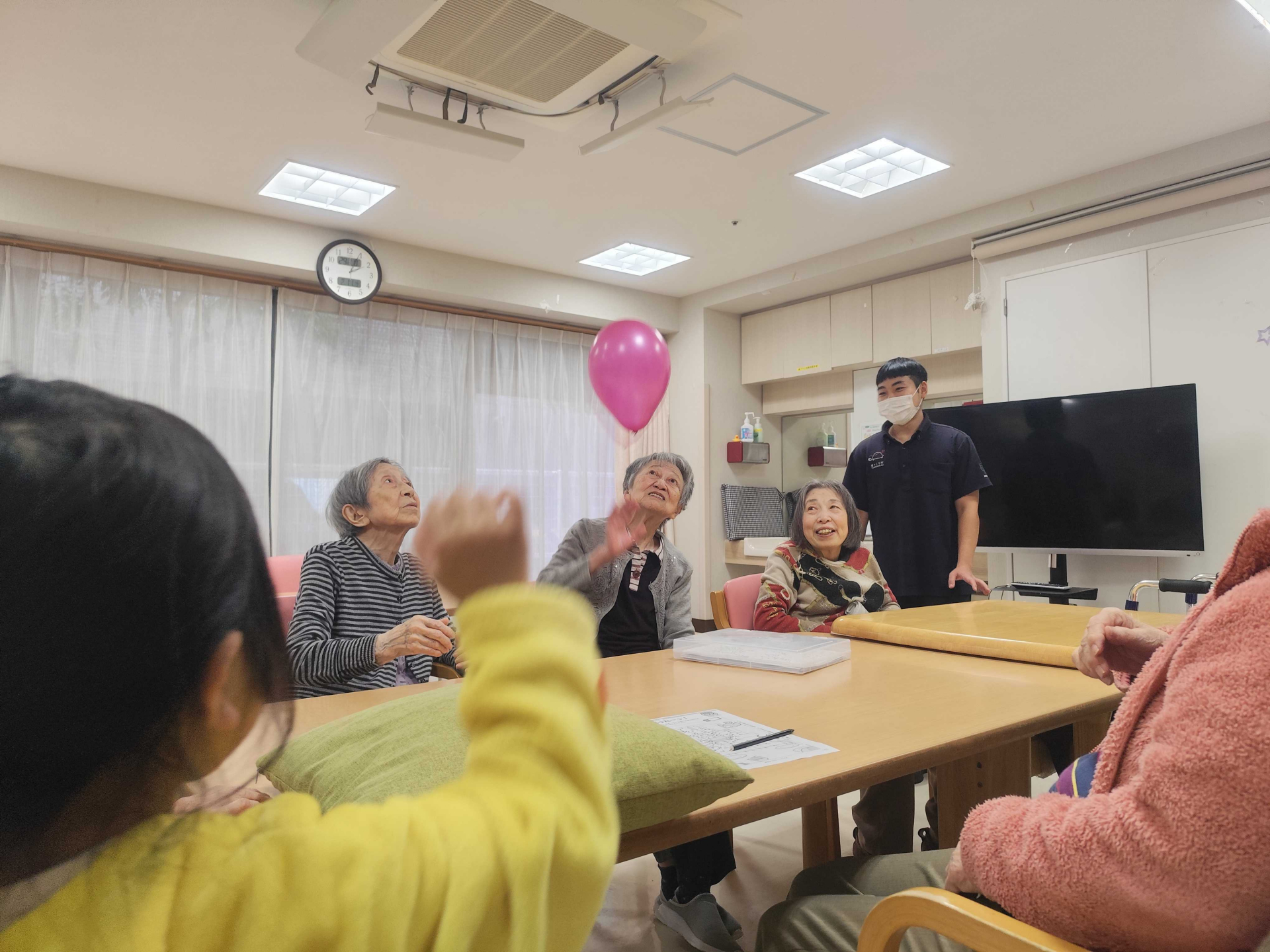 【優っくり村鎌田 レクリエーション活動】風船を使った楽しい運動。