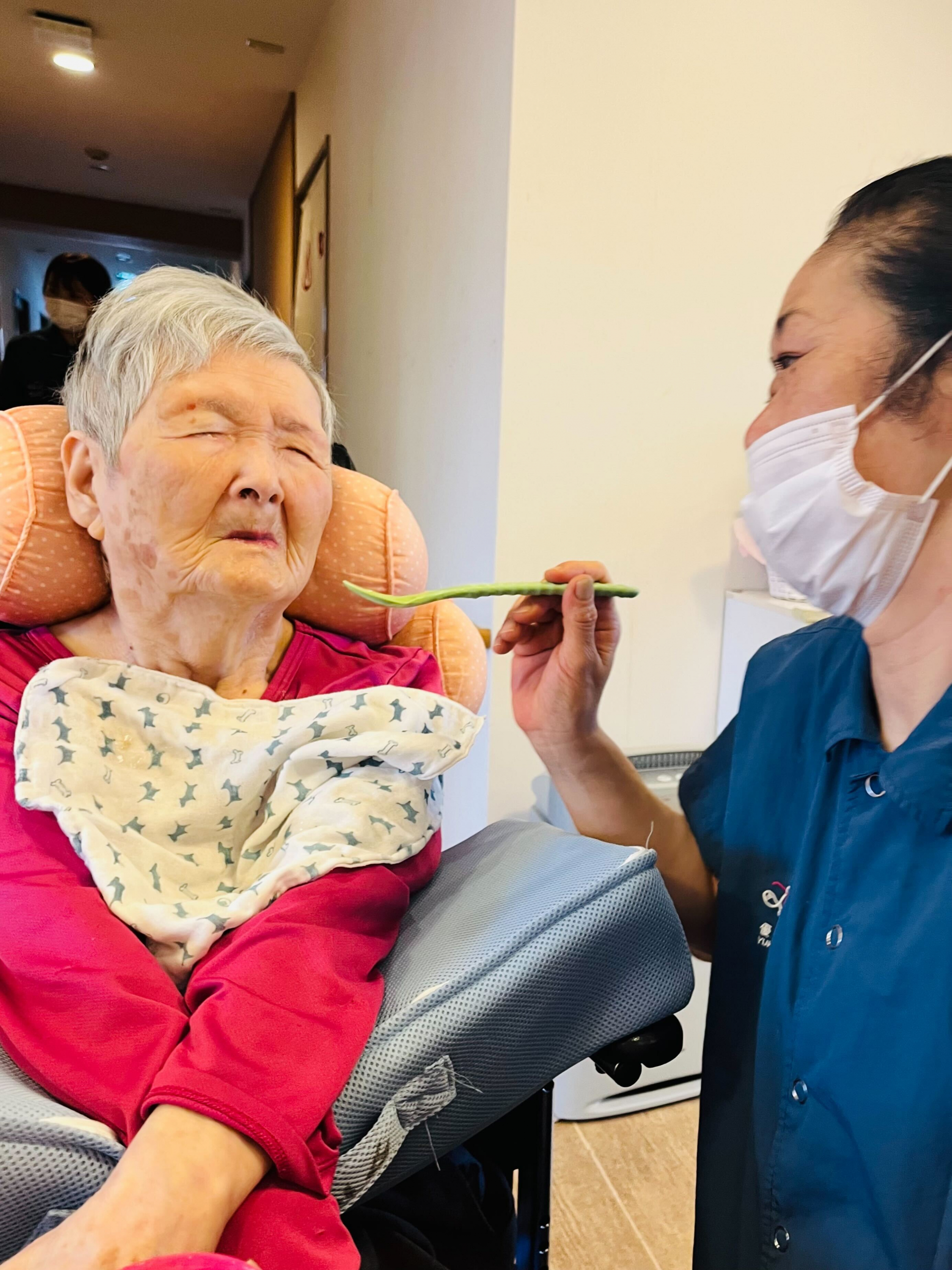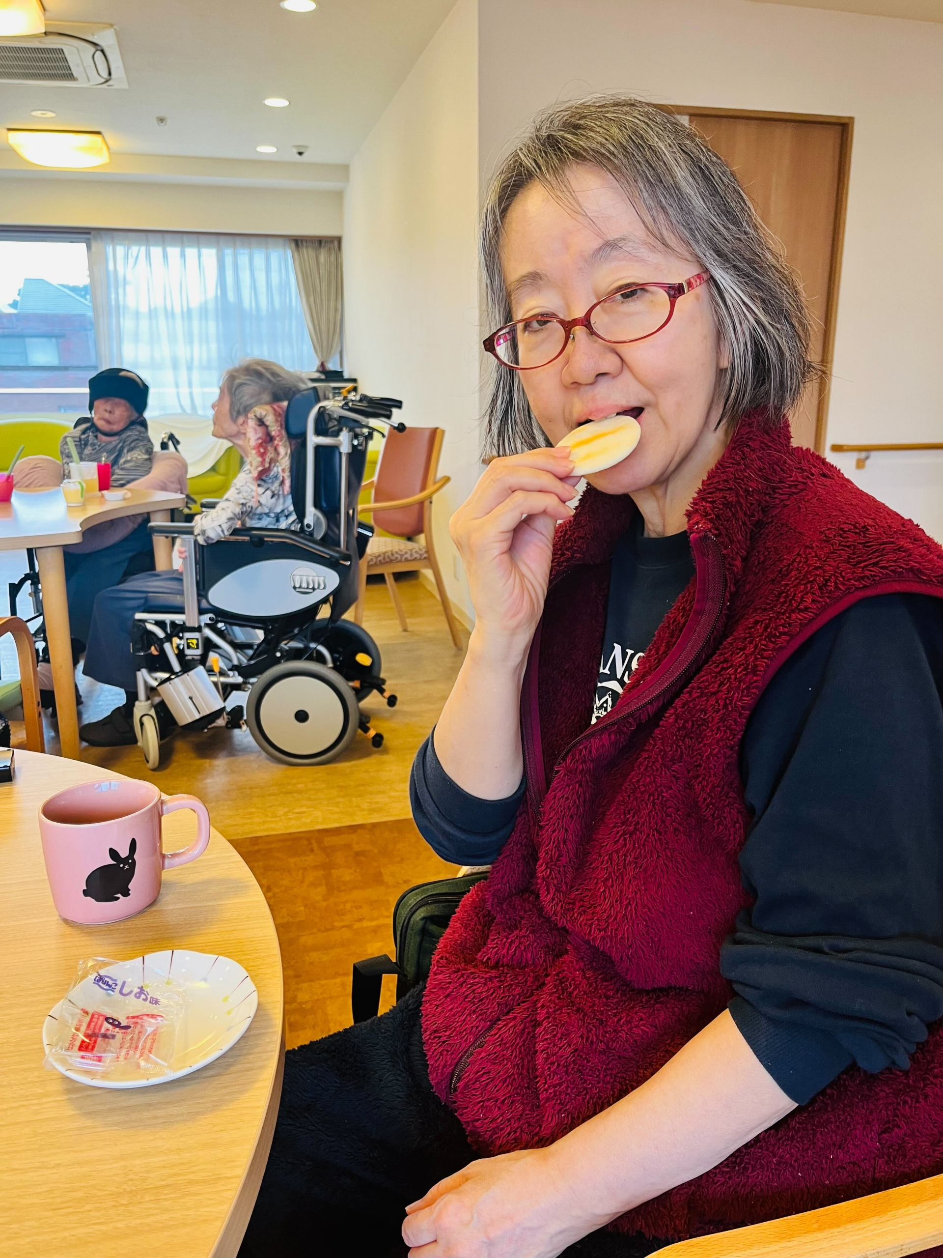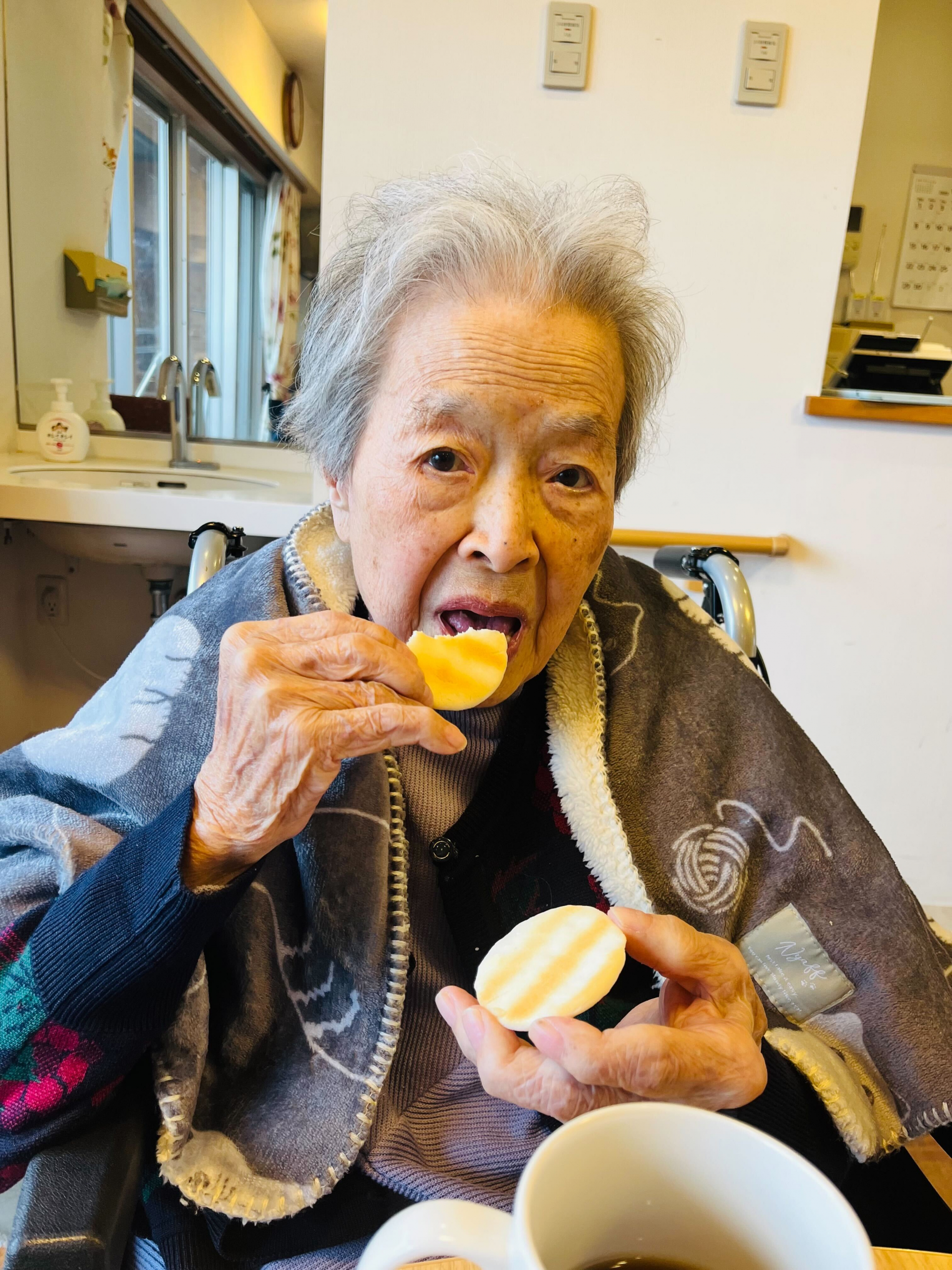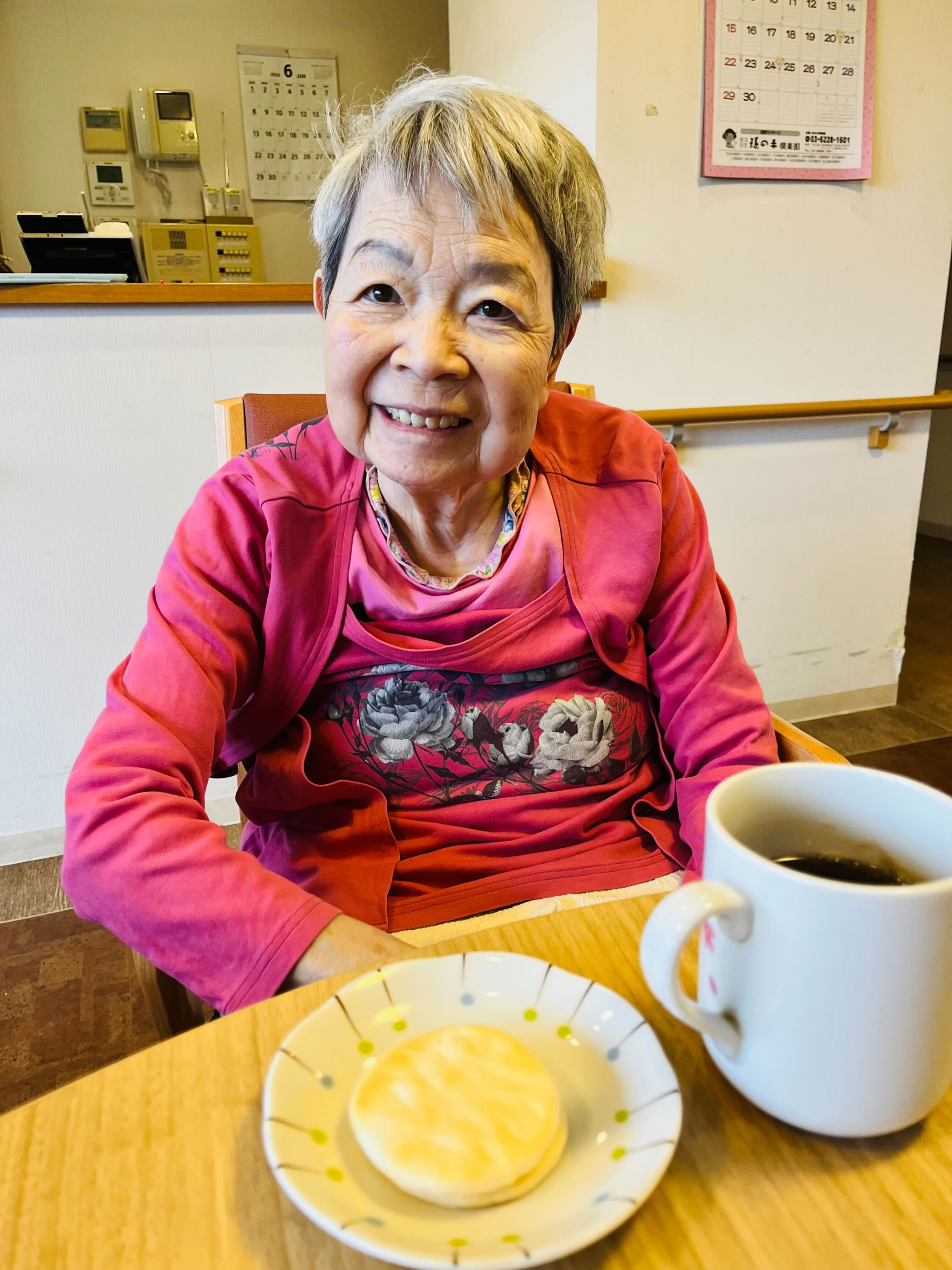 「おやつ何がいいですか?」と職員が皆さんに聞くと「おせんべい!」と1番に答えたS様。