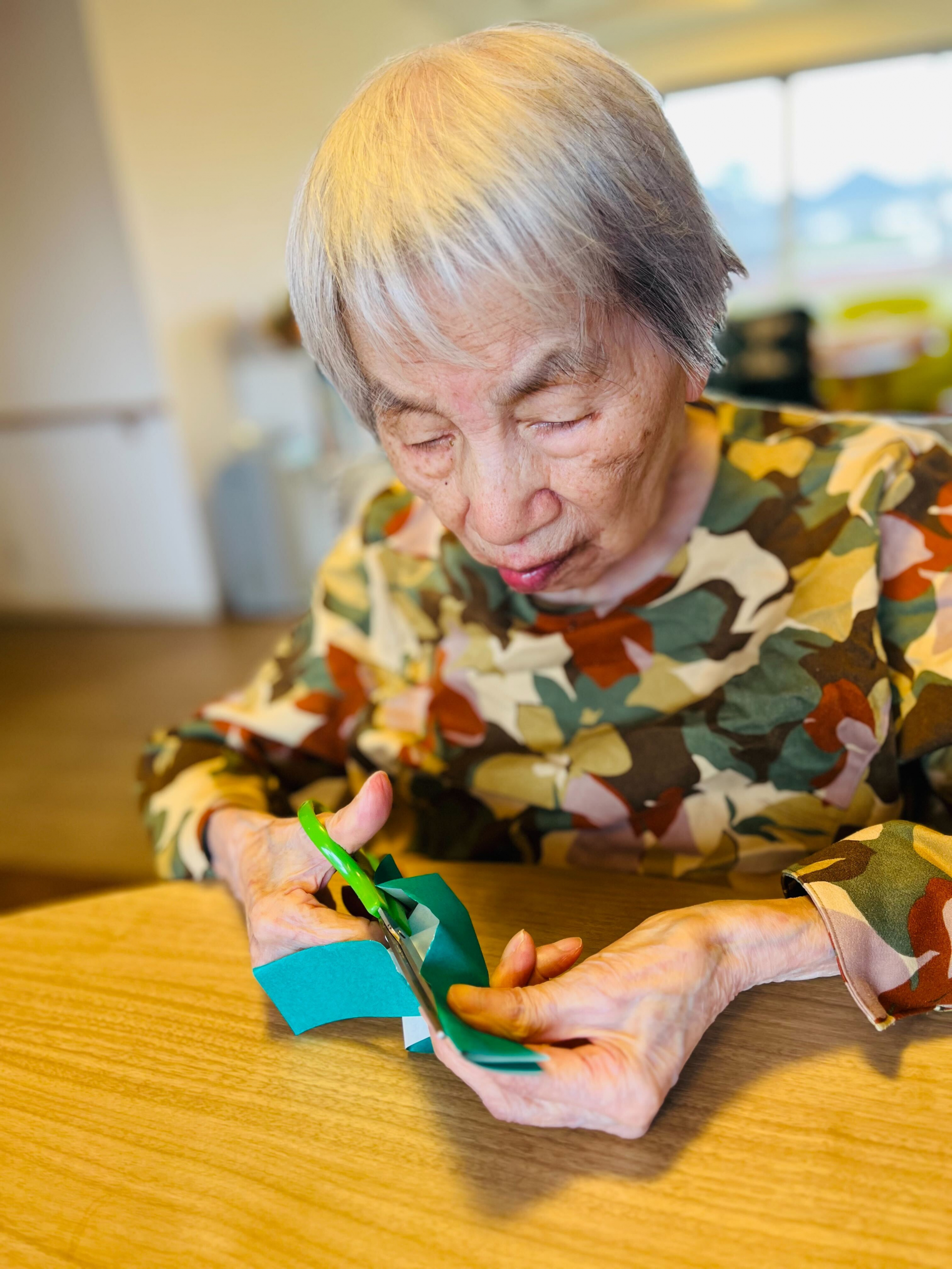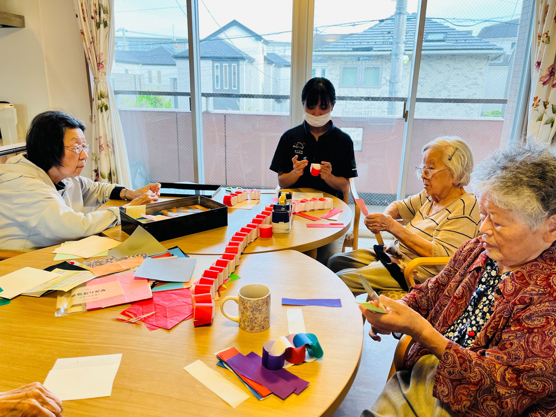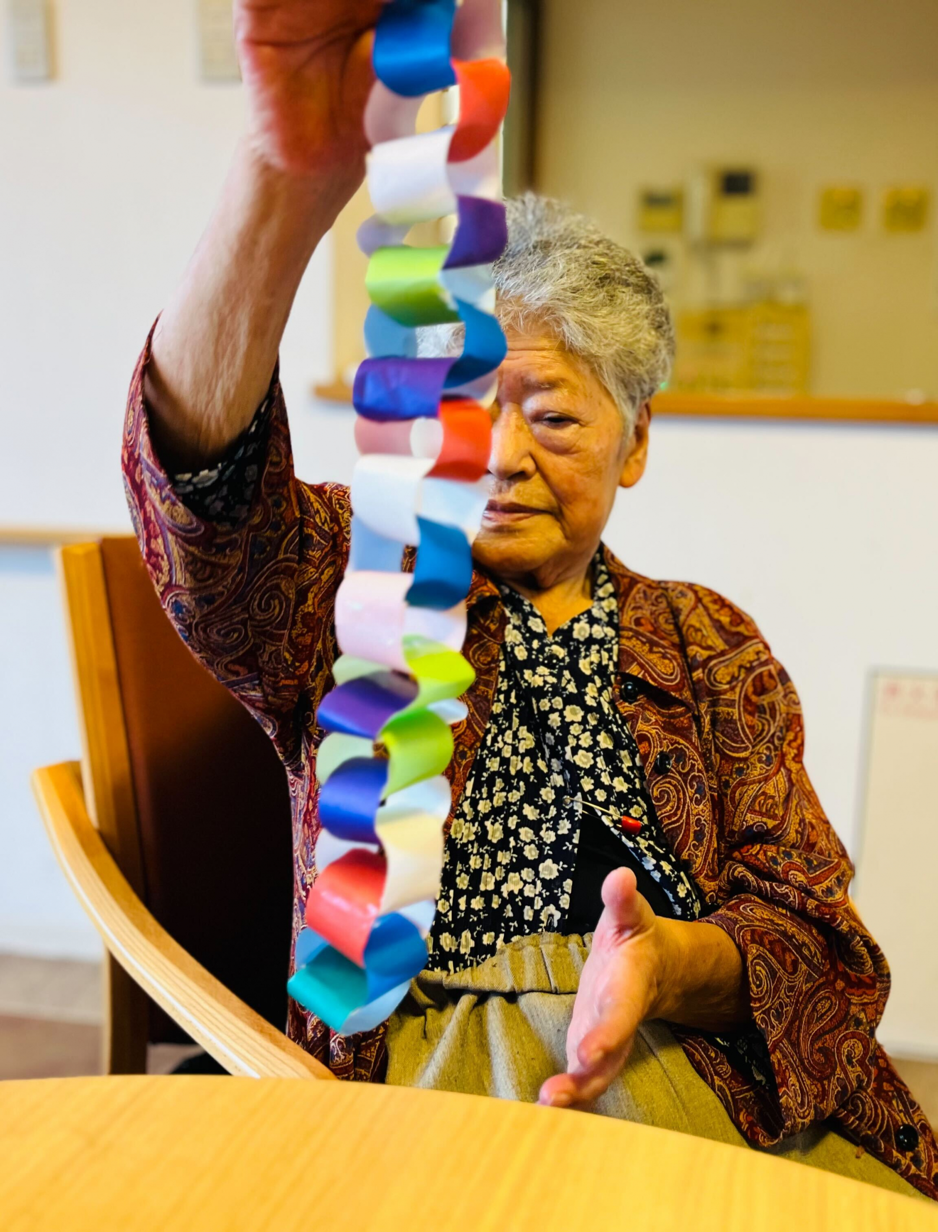 いろんな色の折り紙を切って、繋げて、、、