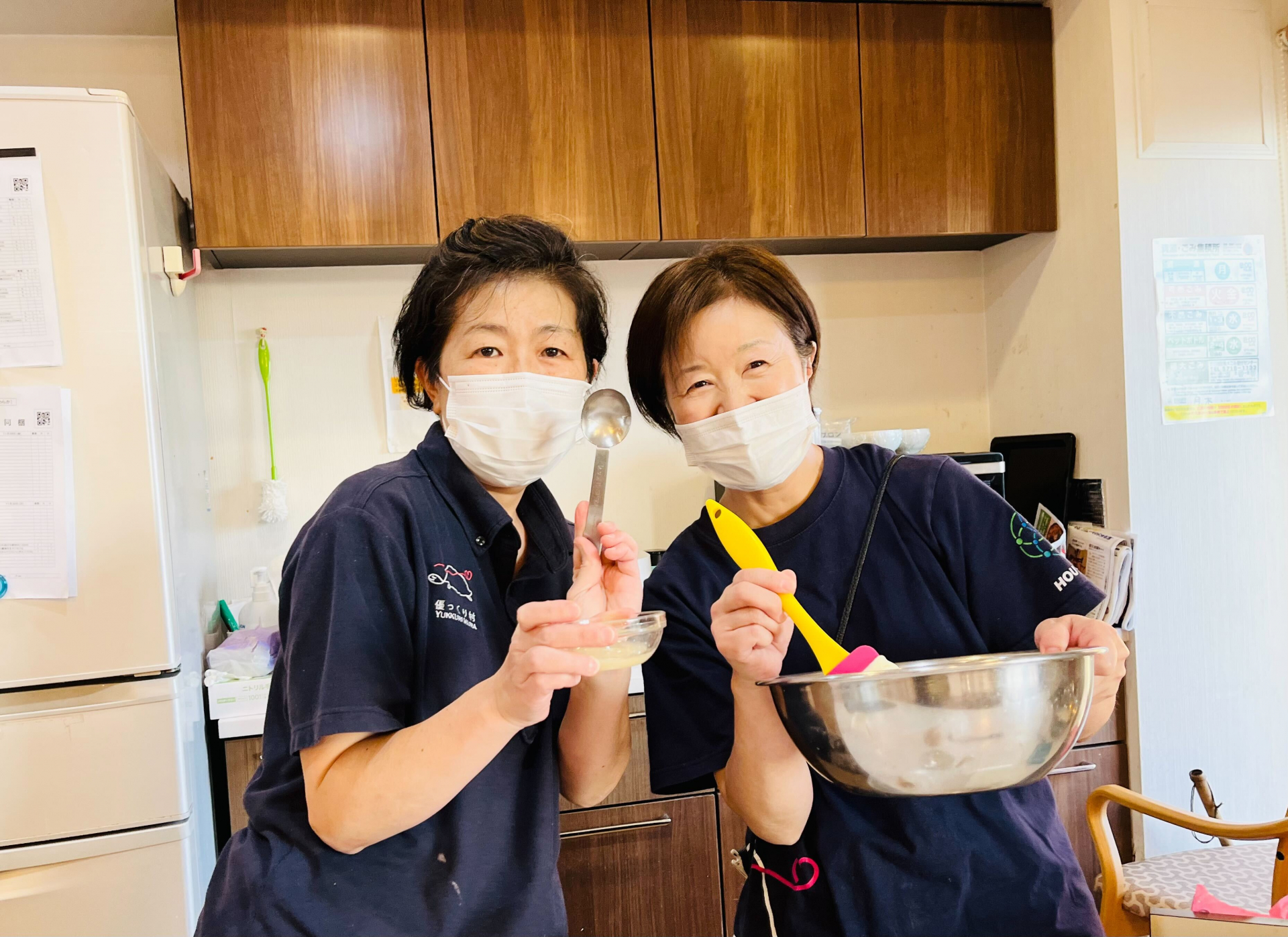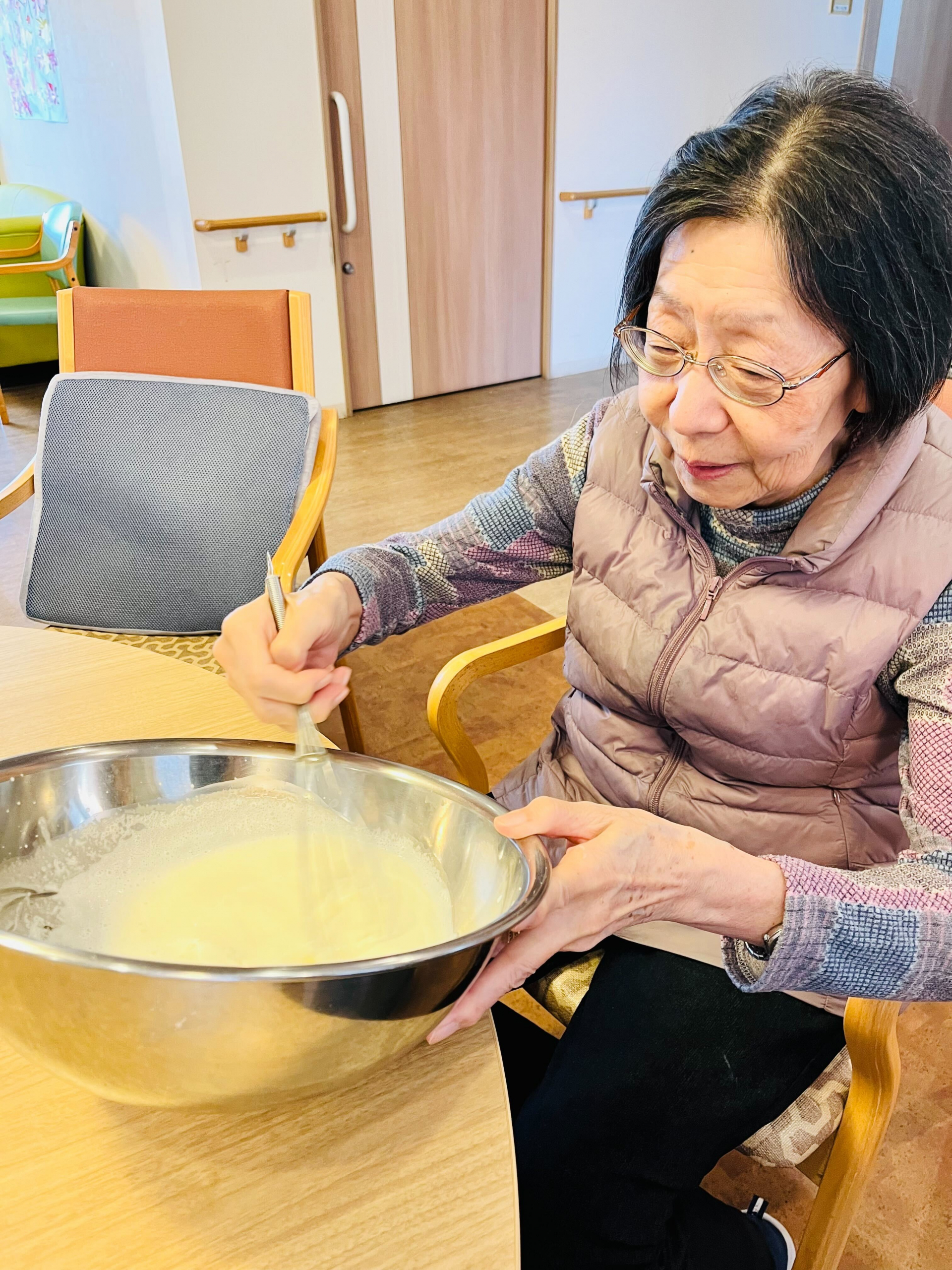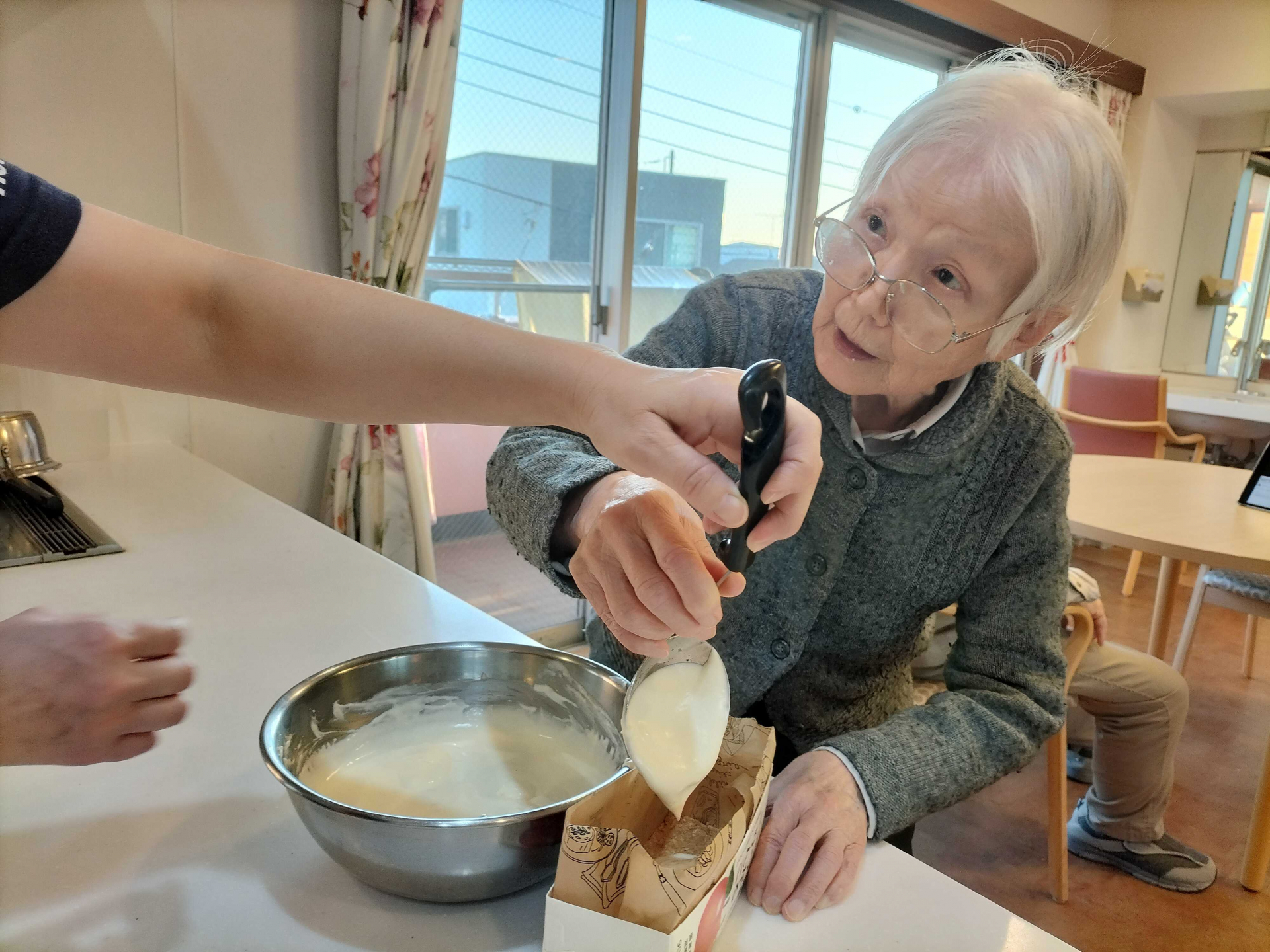 開所式の前日には、入居者の皆様と一緒にお祝いのケーキ作りを行いました。