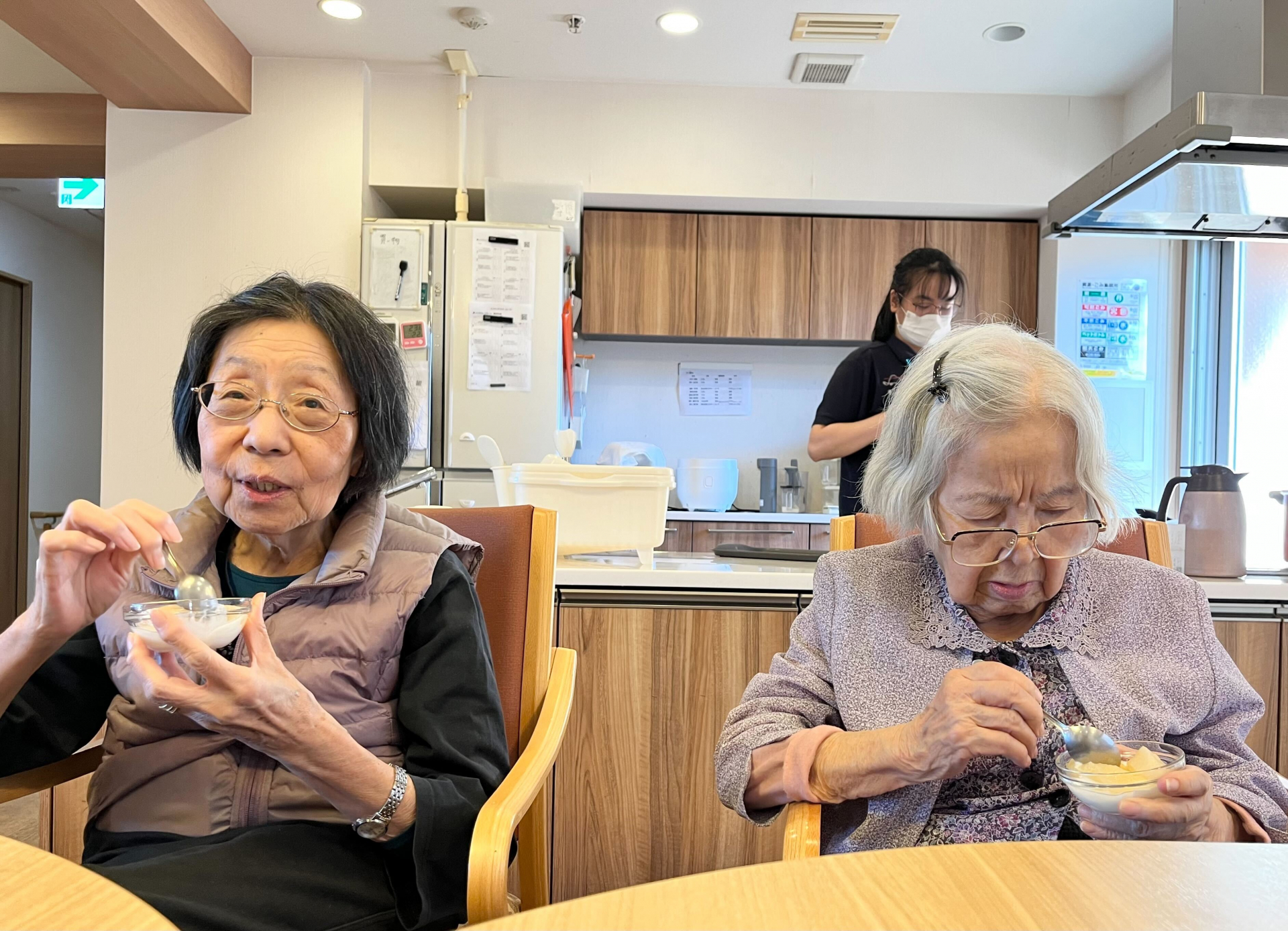 今日のおやつは職員手作りの洋梨のコンポートを添えたヨーグルト。
