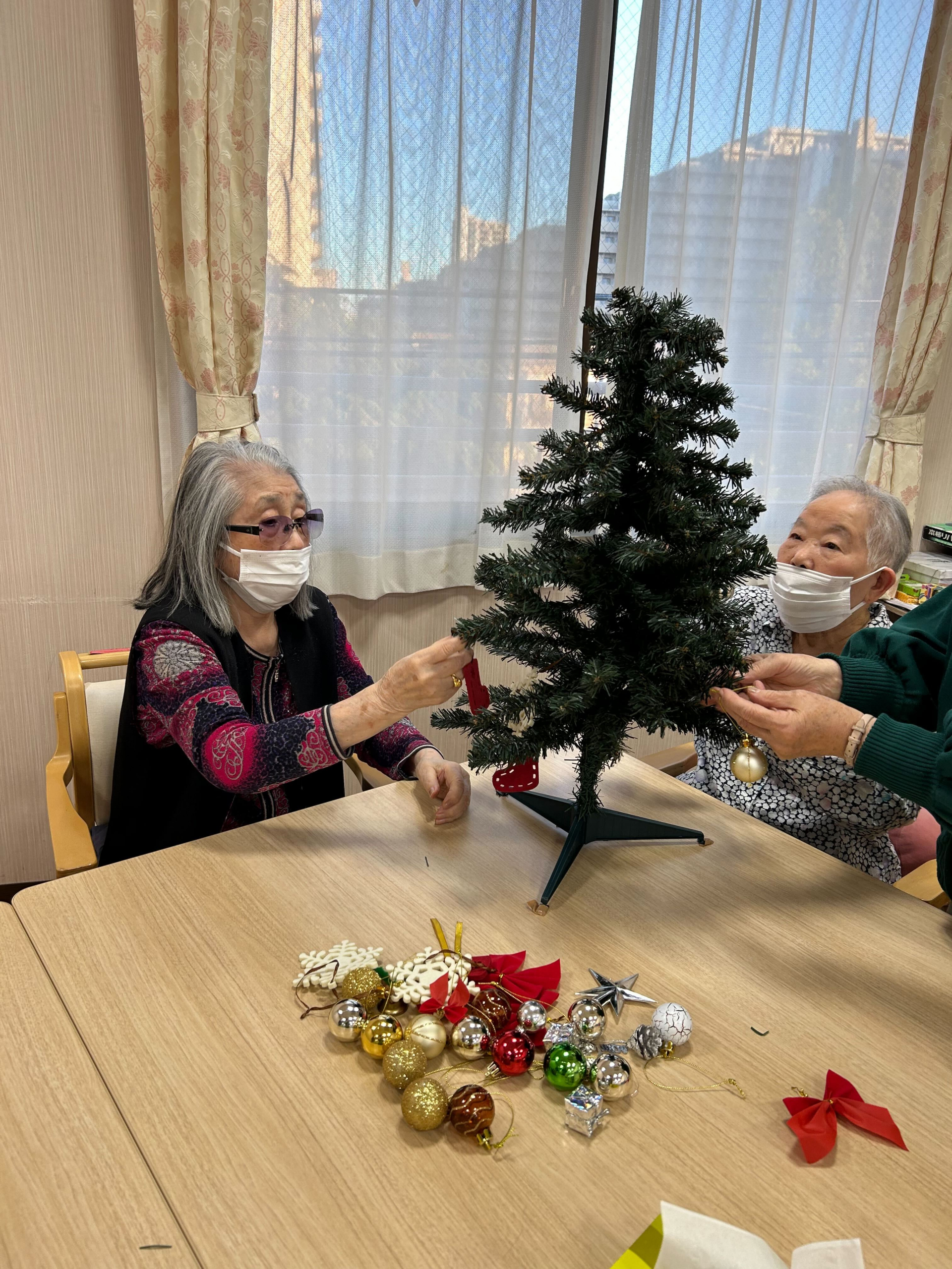 仲良し女子3名様で行うと、あっという間に素敵なクリスマスツリーが出来上がりました!!