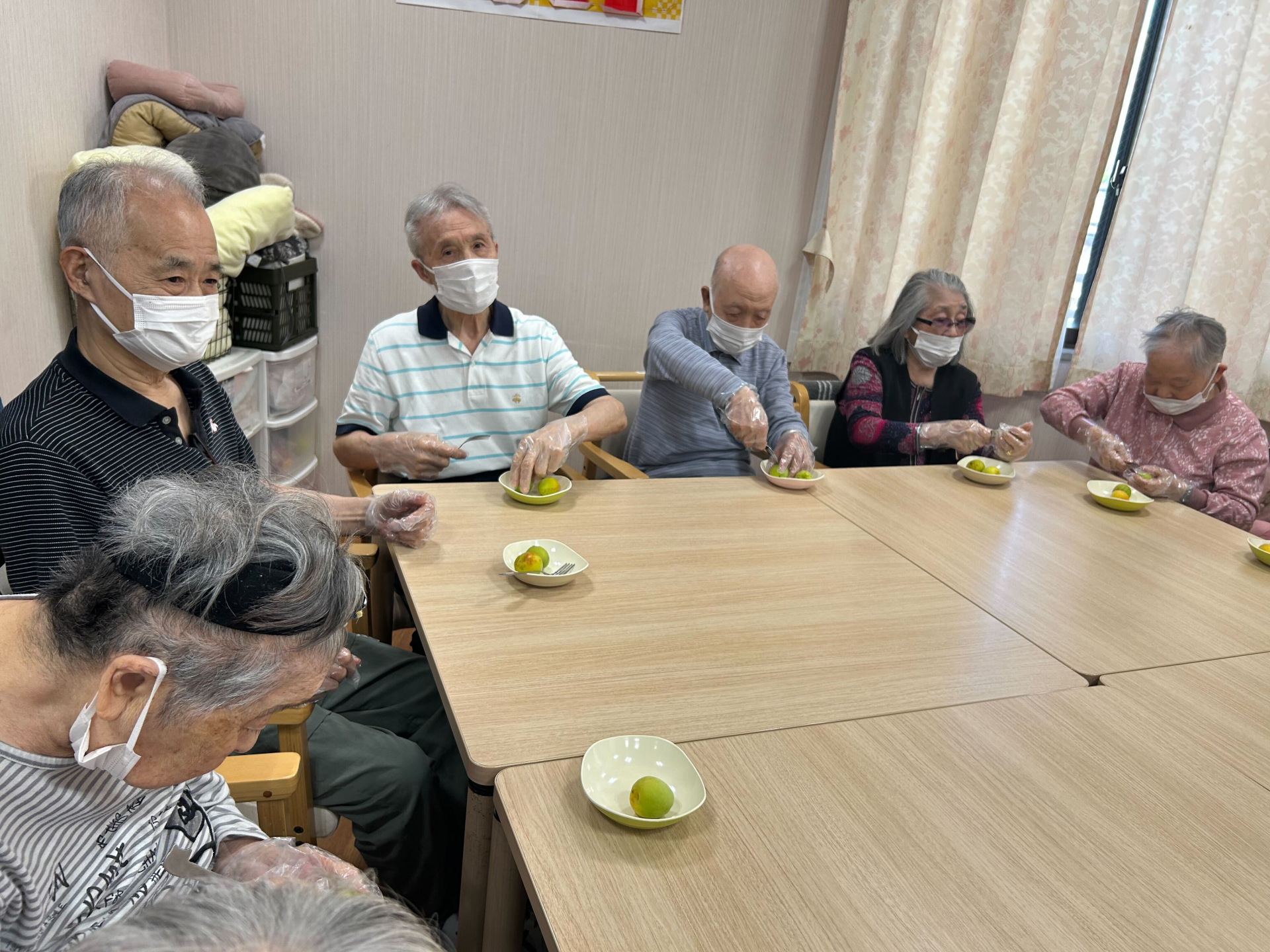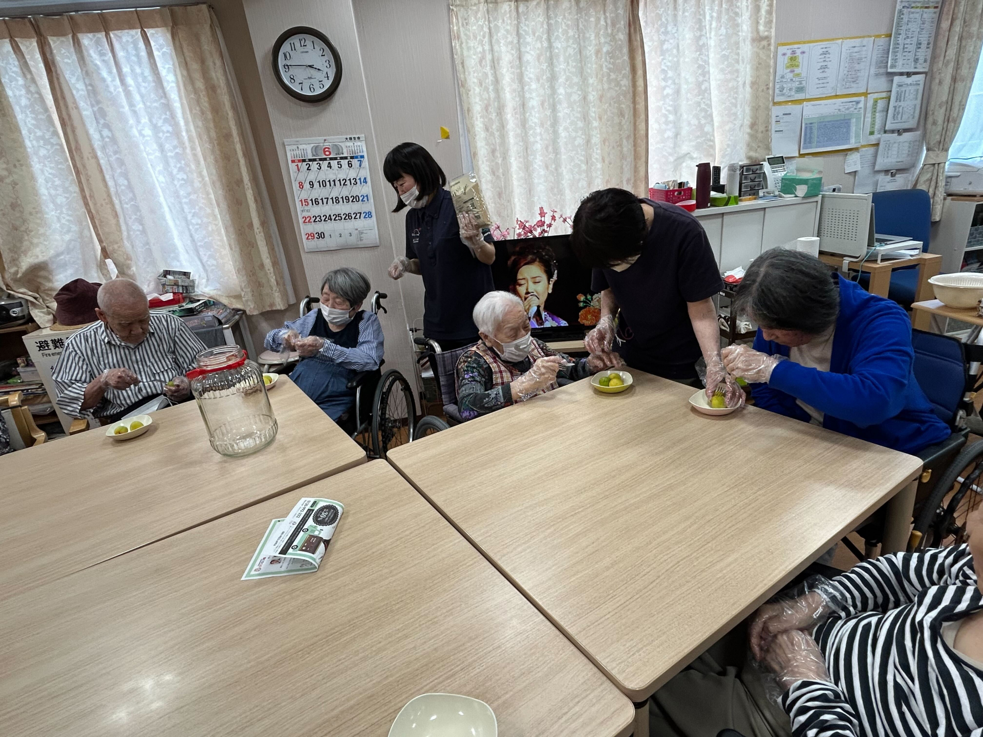 おやつ後、4階に3階の入居者様も集めて、みんなで梅シロップ作りに挑戦しました!!
